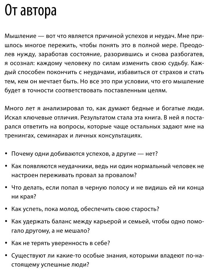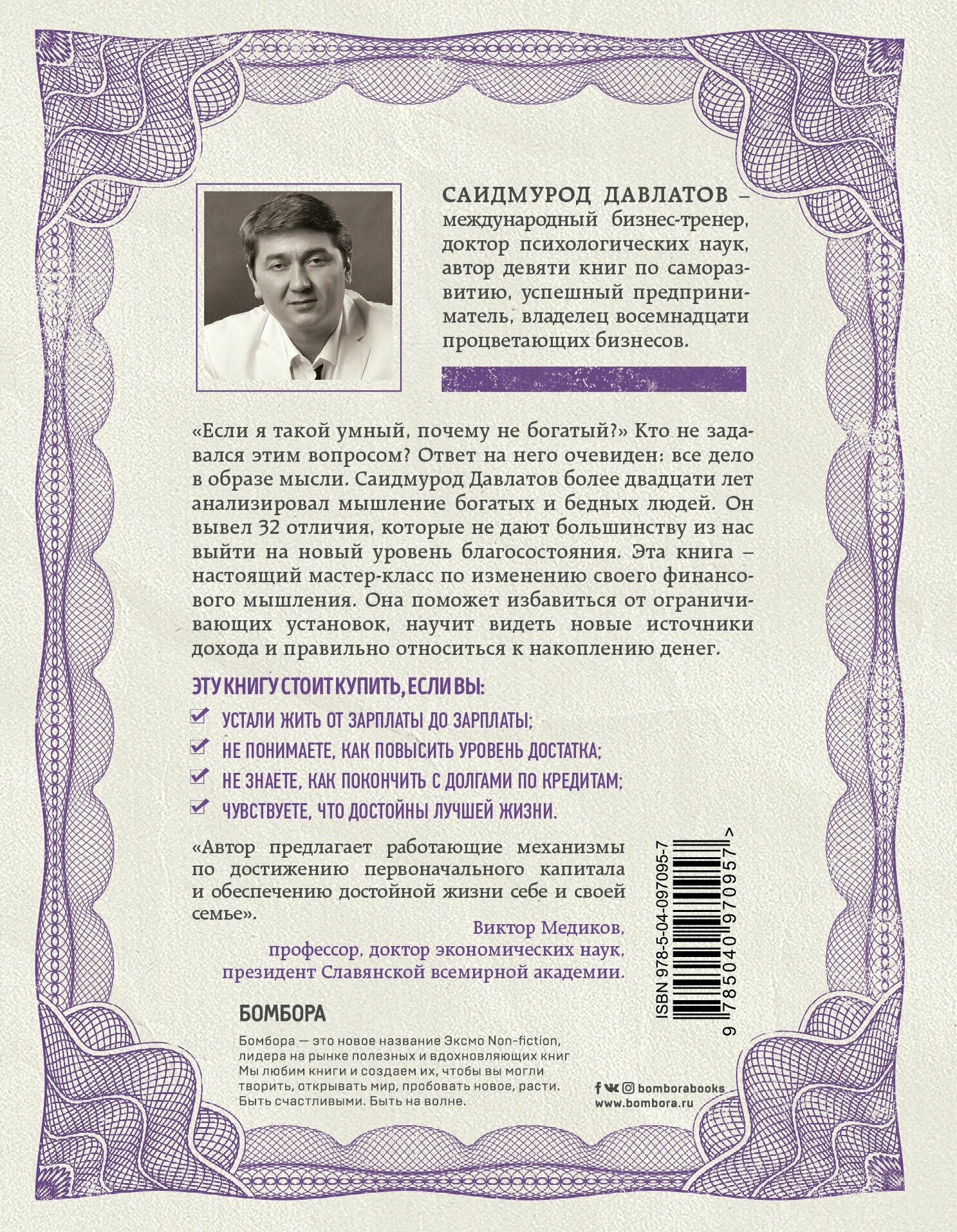 "Если я такой умный, почему не богатый?" Кто не задавался этим вопросом? Ответ на него очевиден: все дело в образе мысли. Саидмурод Давлатов более двадцати лет анализировал мышление богатых и бедных людей. Он вывел 32 отличия, которые не дают большинству из нас выйти на новый уровень благосостояния. Эта книга - настоящий мастер-класс по изменению своего финансового мышления. Она поможет избавиться от ограничивающих установок, научит видеть новые источники дохода и правильно относиться к накоплению денег.
