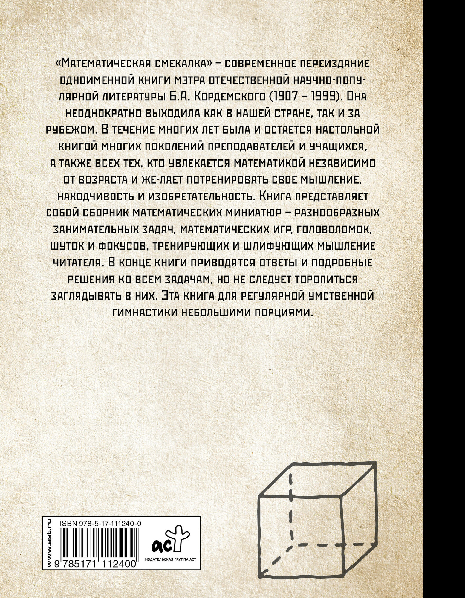 Хорошее и качественное издание.Содержание шикарное: задачи,головоломки и т.д. Четырнадцать различных глав, которые вмещают 327 задач .Триста страниц занимают сами задачи, 150 страниц- ответы.Печать качественная.Офсет приятный на ощупь, цвет сероватый, но смотрится всё очень гармонично и приятно .Задачи набраны более крупным шрифтом, чем ответы, но это и понятно. Покупкой очень довольна.Цену, я платила 509 рублей ,считаю оправданной. И ещё у меня вышел казус, одновременно заказала Кордемского того же АСТ, но под редакцией Фёдорова .Почему-то показалось , что это что-то другое. Так вот , вариант под редакцией Фёдорова отличается только тем, что там только семь неполных глав и 197 задач. Формат уже, офсет шероховатый и более холодного цвета.