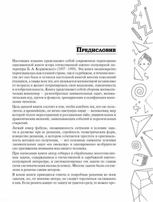 Книга мэтра отечественной научно-популярной литературы Бориса Анастасьевича Кордемского - сборник математических миниатюр: разнообразных занимательных задач, математических игр, головоломок, шуток и фокусов. Она неоднократно выходила как в нашей стране, так и за рубежом.