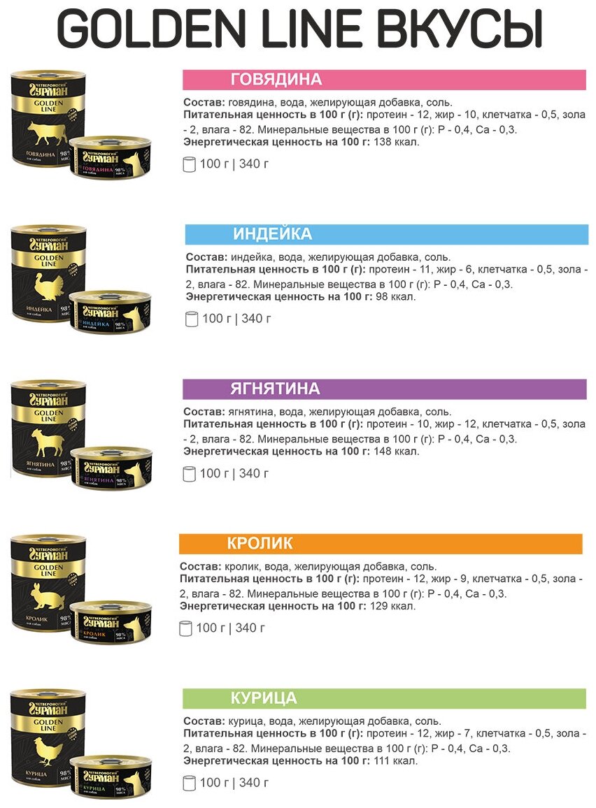 Golden line - это корм суперпремиум класса, приготовленный из одного вида мяса без добавления субпродуктов и растительных компонентов. Открыв баночку, вы увидите крупно нарезанное сочное филе в натуральном желе. Golden line – это 98% настоящего мяса и 2% желе. Корма для щенков отличаются более нежной текстурой, содержат два вида мяса и витаминно-минеральный комплекс.Мясо Golden Line отлично сочетается с моментальными кашами Четвероногий гурман. Норма кормления: 70 - 90 г на 1 кг веса животного. Суточную норму разделить на два приема кормления. Употреблять при комнатной температуре. Объем банки: 500 г