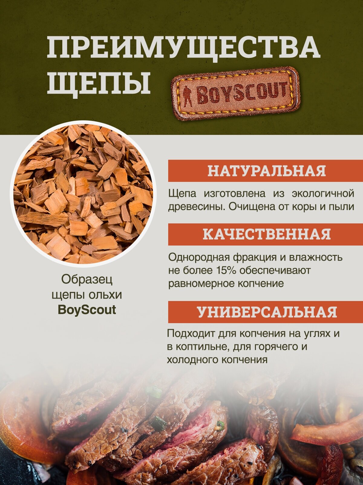 Щепа Boyscout изготовлена из натуральной древесины. Щепа отлично подходит для копчения свинины, рыбы и дикой птицы. Широко применяется знатоками кулинарии. Придает продукту копчения золотистый цвет и особый аромат. Однородный состав позволяет добиться равномерного копчения и улучшает вкус. Длительный срок хранения достигается за счет оптимальной влажности щепы.