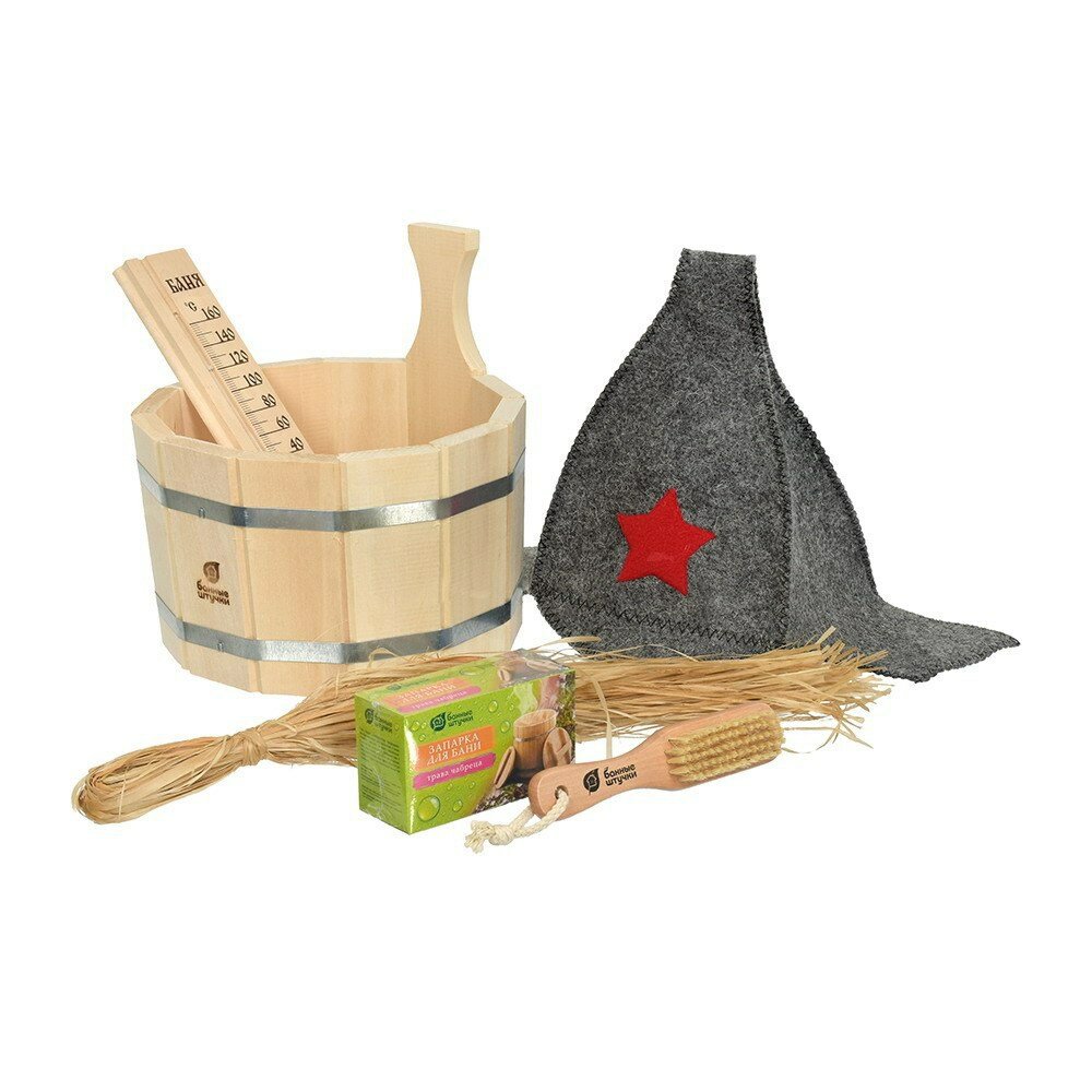 | В наборе | шапка (Буденовка), ушат/бадья (5 л), щетка (с пемзой), запарка, песочные часы, мочало (лыковое) |