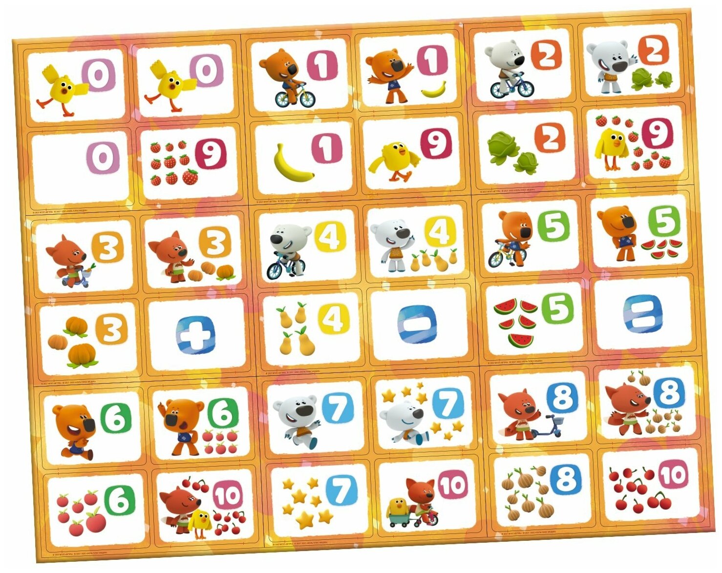 Неутомимые друзья Ми-Ми-Мишки любят не только природу и науку, но и развитие. Они хотят помочь малышку с такой важной вещью, как счет. Благодаря магнитным карточкам с цифрами и любимыми персонажами на них, процесс обучения покажется ребенку веселым и задорным. Так как карточки магнитные, малыш может приклеить их на холодильник, чтобы каждый раз заглядывая внутрь, повторять счет. Удачи!
