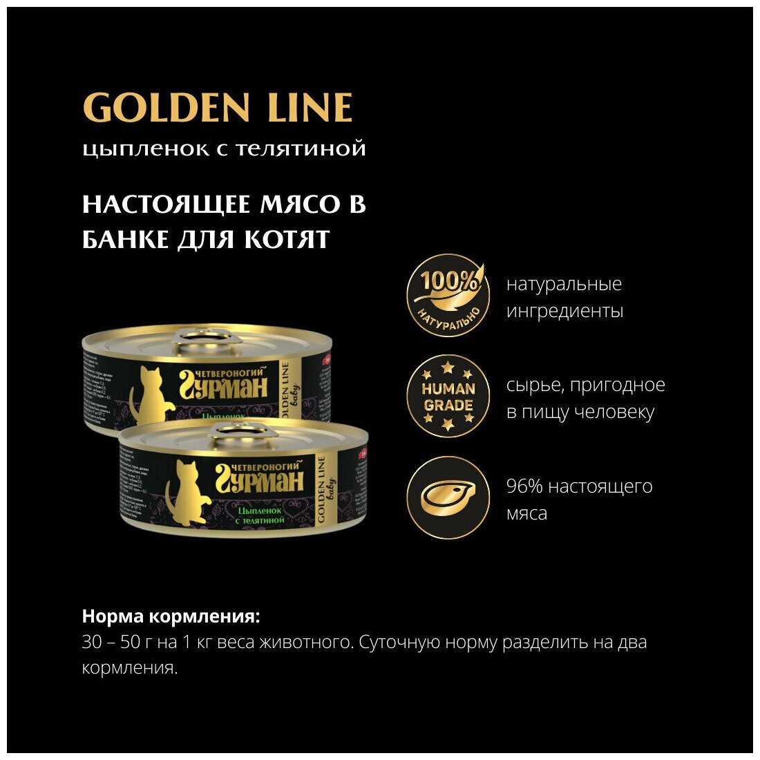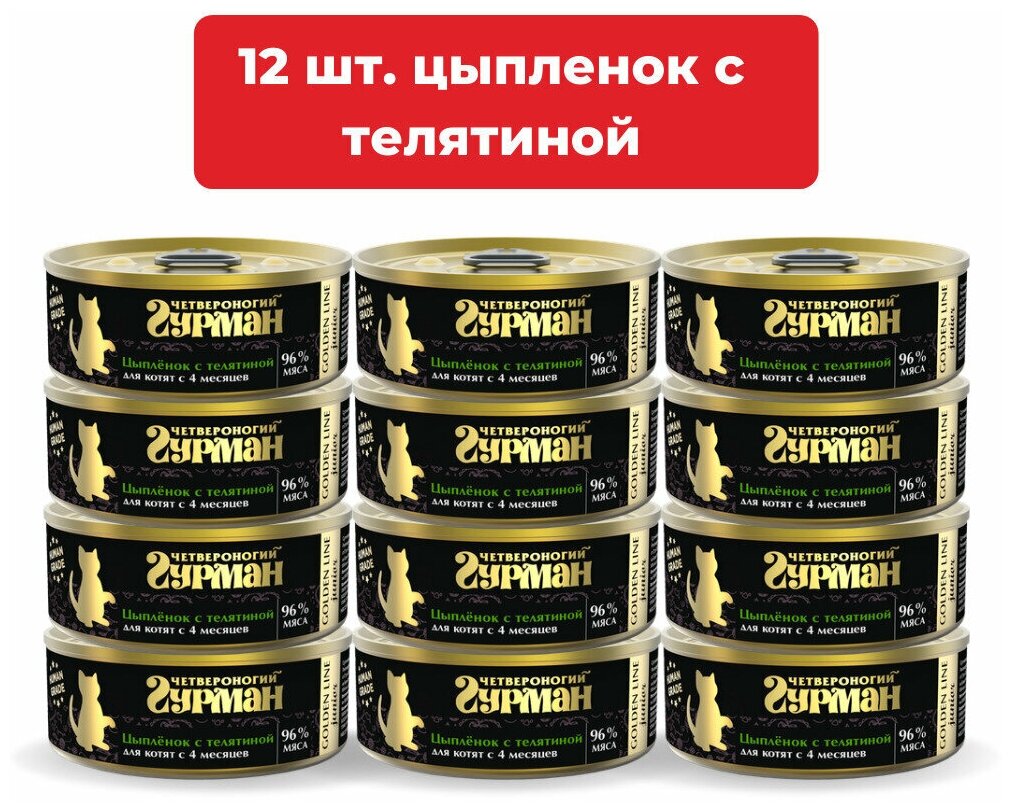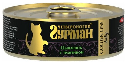 Консервы Золотая линия для Котят Цыпленок с телятиной в желе (цена за упаковку) - «Четвероногий гурман» Golden line - это корм суперпремиум класса, приготовленный из одного вида мяса без добавления субпродуктов и растительных компонентов. Открыв баночку, вы увидите крупно нарезанное сочное филе в натуральном желе. Golden line – это 98% настоящего мяса и 2% желе.