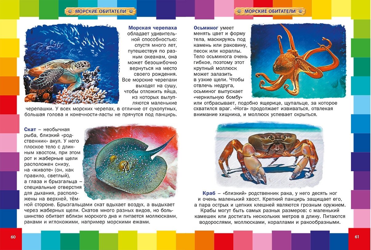Энциклопедия действительно очень яркая: по периметру разворота страницы выкрашены в цвета радуги, сами картинки очень насыщенного цвета. И я до сих пор иногда сомневаюсь: это реальные фотографии в энциклопедии или все-таки просто качественные рисунки.