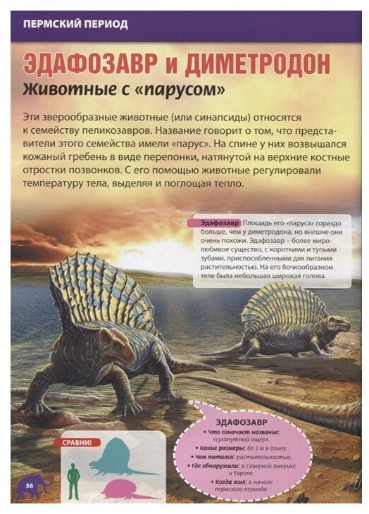 Мир динозавров и доисторических животных огромен и многообразен. Постоянное изменение климата на Земле вынуждало приспосабливаться и изменяться все живые существа. Огромные стрекозы с размахом крыльев, как у утки, или маленькие лошадки размером с собаку - вот примеры такого приспособления. Из этой красочной энциклопедии ты сможешь узнать большое количество интересных сведений и необычных фактов о динозаврах и доисторических животных: орнитолестес был самым быстрым хищным динозавром, мощный динозавр протоцератопс был травоядным и мог защищаться только огромным клювом и панцирем вокруг шеи, у диметродона, хищной рептилии, на спине был парус, который работал как солнечная батарея, а у птеригота, морского скорпиона, было целых четыре глаза. Надеемся, что на страницах нашей книги ты сможешь узнать много нового и получишь большое удовольствие от путешествия по доисторическому миру!