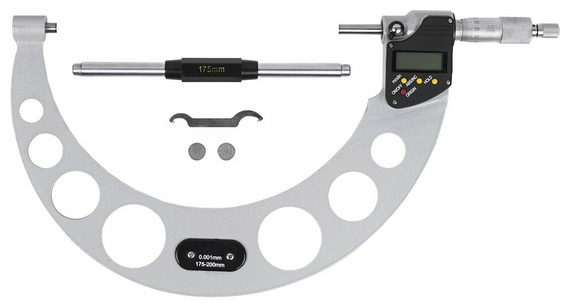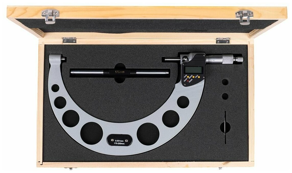 Микрометр электронный цифровой МКЦ-200 0.001 SHAN - измерительный прибор для высокоточного (с погрешностью от 2 до 50 мкм) определения линейного размера. Использование микрометра возможно в любой производственной области, где требуется определение размеров детали – механическая обработка, точная сборка, настройка оборудования и др. Конструкция микрометра состоит из трех основных элементов: Рамы в виде полукруга для фиксации измеряемой детали; Ручки с трещоткой и неподвижным стеблем со шкалой и измерительным барабаном; Винта с неподвижной гайкой для измерения величинЗамер с помощью микрометра выполняется посредством перемещения винта в неподвижной гайке. Цифровые микрометры (МКЦ) оснащенные электронным измерительным устройством, пользуются популярностью благодаря удобству и точностью измерения, а также дополнительными возможностями инструмента: Возможность производить замер с точностью до 1 мкм; Встроенная калибровка; Цифровое табло для быстрого и точного получения результата; Переключение между метрической и дюймовой системами;