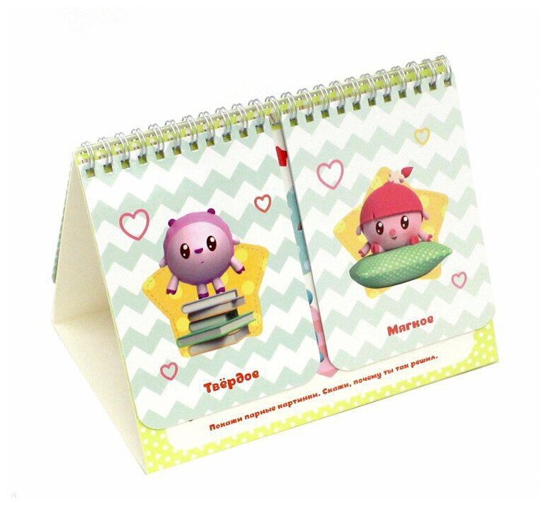 Картонное основание постоянно возвращается в исходное состояние, и книжка переворачивается. При этом картон плотный, карточки заламинированы, что защищает их от воды, грязи и еды. Карточки на пружинках иногда немного застревают при переворачивании.