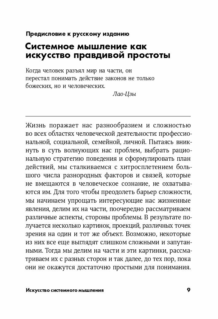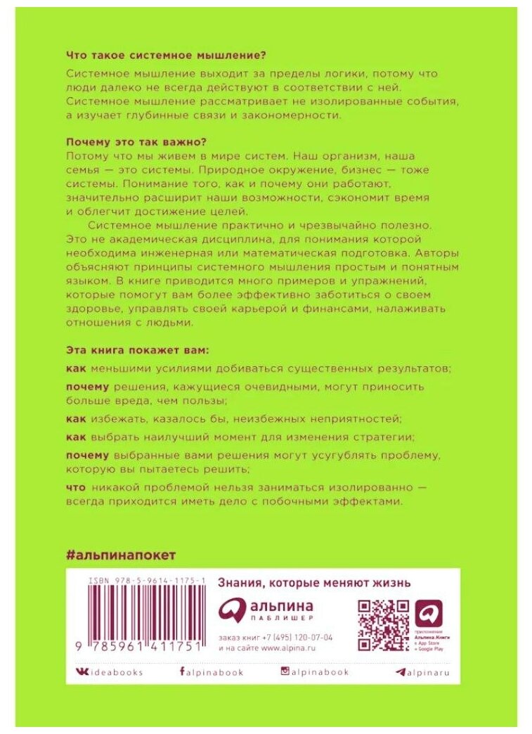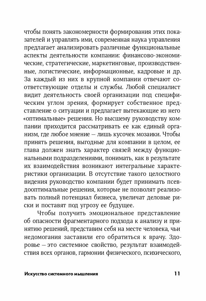 Данная книга — введение в искусство системного мышления, рассказ о принципах и методах целостного понимания сложных систем, о свойствах, поведение которых определяется характером связей между их компонентами и представлениями вовлеченных в них людей. Авторам удалось достичь необычного сочетания образности и глубины благодаря описанию проблемных ситуаций при помощи причинно-следственных циклов — цепочек усиливающих и балансирующих обратных связей. Такой подход дает читателю уникальную возможность одновременно использовать свои способности к образному восприятию и логическому мышлению, чтобы найти неординарные творческие решения.