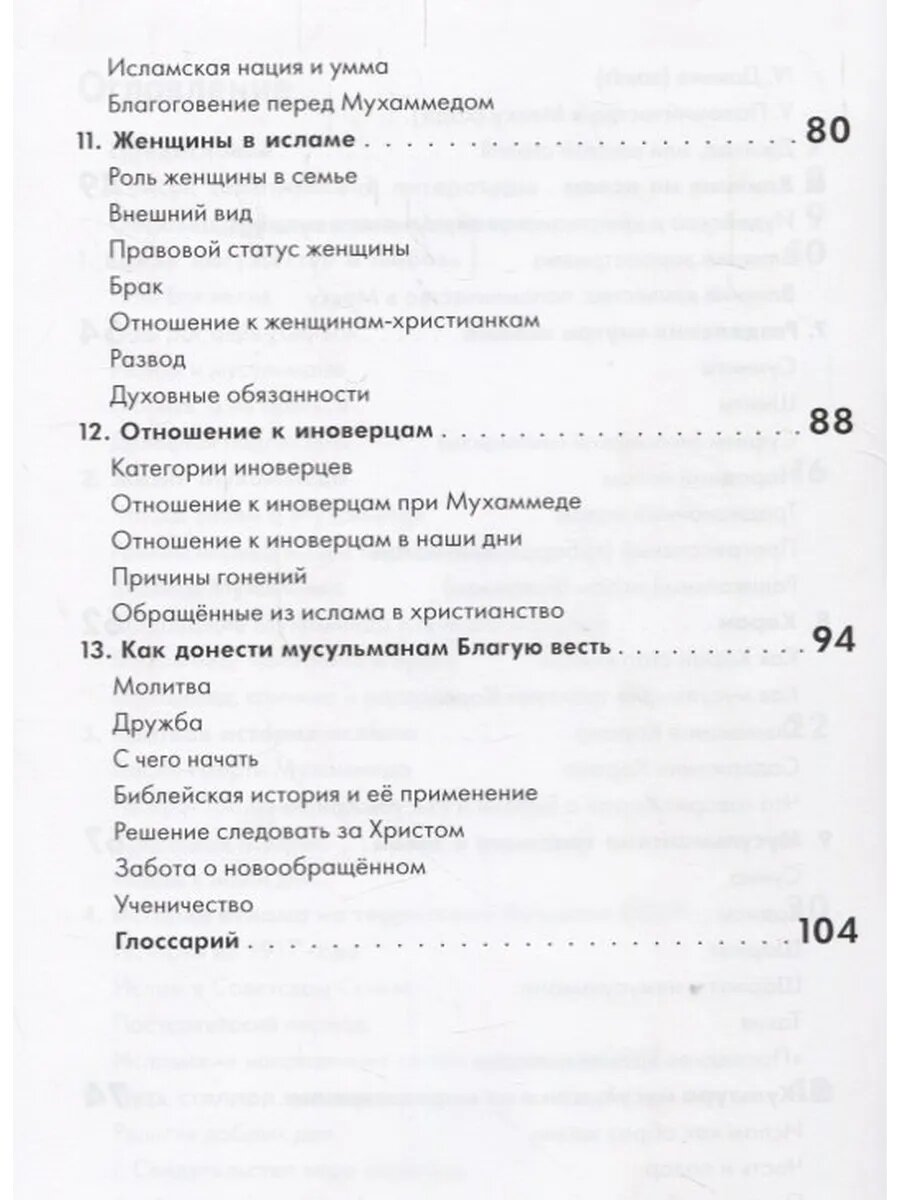 О том, как донести Благую весть мусульманскому миру рассказывается в последней главе, за которой последует краткий глоссарий исламских терминов. Все главы включают в себя чтение библейских стихов, которые необходимы для лучшего понимания темы.