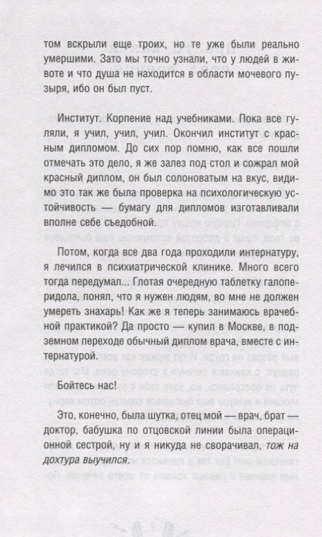 Ожидал большего.. Сразу не понравилось, крупный шрифт с большим отступом по полям. Ощущается как обман читателя, купившего книгу. Опечатки и странные речевые обороты. Содержание несколько уныло и каких то глубоких мыслей о бренной нашей жизни не вызывает. Рекомендую для читателей ооочень далеких от медицины.