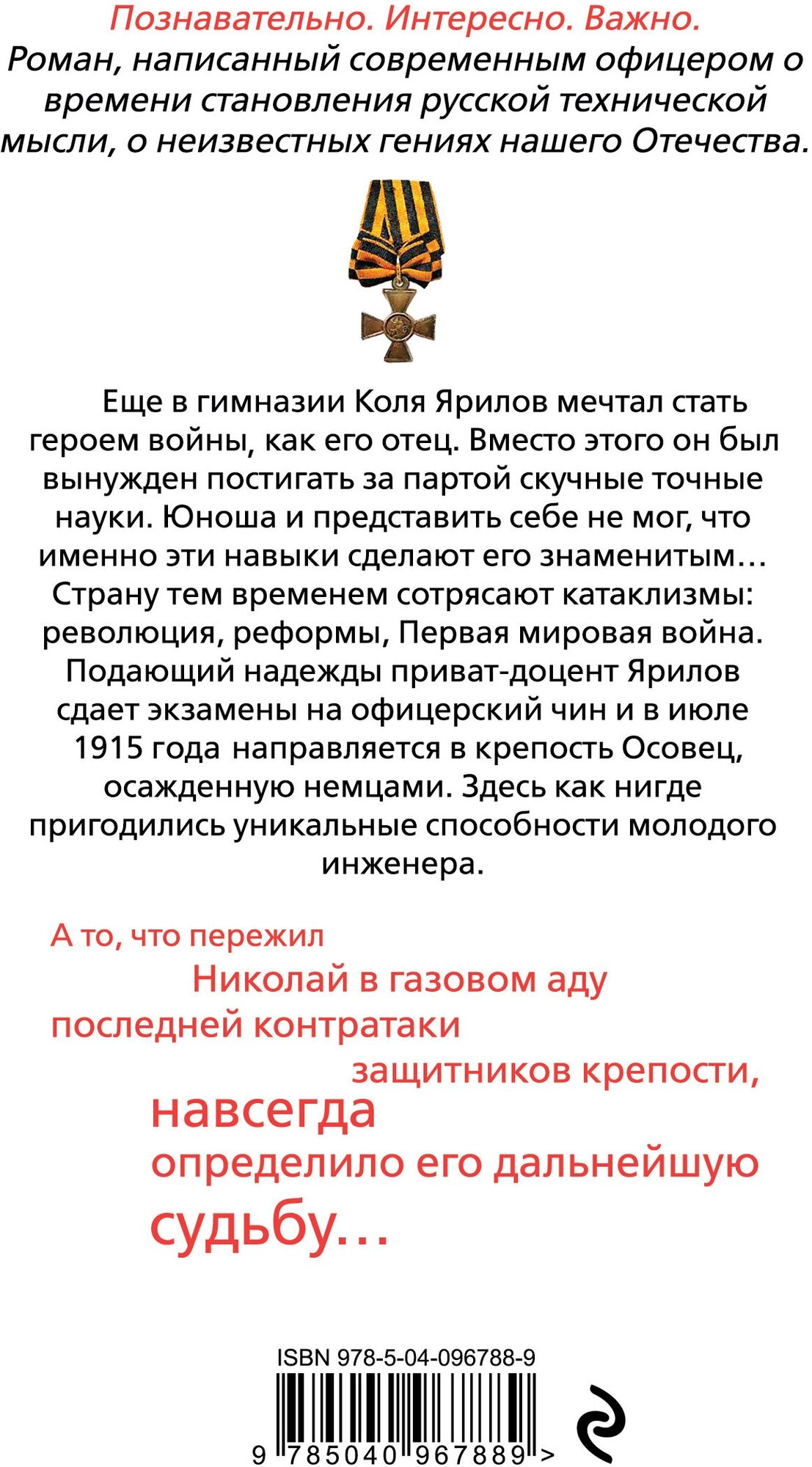Познавательно. Интересно. Важно. Роман, написанный современным офицером о времени становления русской технической мысли, о неизвестных гениях нашего Отечества. Еще в гимназии Коля Ярилов мечтал стать героем войны как его отец. Вместо этого он был вынужден постигать за партой скучные точные науки. Юноша и представить себе не мог, что именно эти навыки сделают его знаменитым… Страну тем временем сотрясают катаклизмы: революция, реформы, Первая мировая война. Подающий надежды приват-доцент Ярилов сдает экзамены на офицерский чин и в июле 1915 г. направляется в крепость Осовец, осажденную немцами. Здесь как нигде пригодились уникальные способности молодого инженера. А то, что пережил Николай в газовом аду последней контратаки защитников крепости, навсегда определило его дальнейшую судьбу…