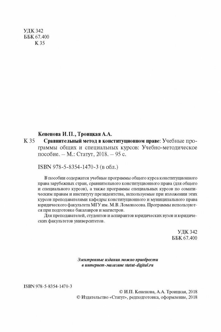 Сравнительный метод в конституционном праве. Учебные программы общих и специальных курсов. Учебно-методическое пособие (Кененова Ирина Павловна, Троицкая Александра Алексеевна); Статут, 2018
