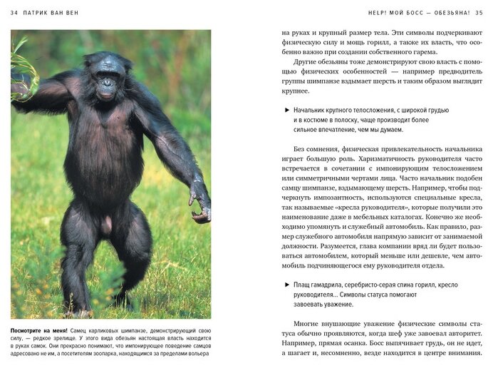 «Ваш босс — на самом деле просто обезьяна в костюме», — утверждает голландский биолог и коуч Патрик ван Вен, чей солидный опыт наблюдений за приматами в зоопарке и общения с коллегами в многочисленных компаниях лег в основу книги, которая стала настоящим бестселлером в Европе и выдержала уже 17 переизданий. В последнее, обновленное, издание включены уникальные фотографии животных, сделанные автором и его помощниками, — потрясающий калейдоскоп эмоций, на которые способны наши ближайшие родственники обезьяны, яркая иллюстрация «всего человекообразного». Не побоявшись сравнить себя с обезьянами, вы начнете лучше понимать действия своих коллег и руководителей и намного эффективнее строить взаимоотношения на рабочем месте.