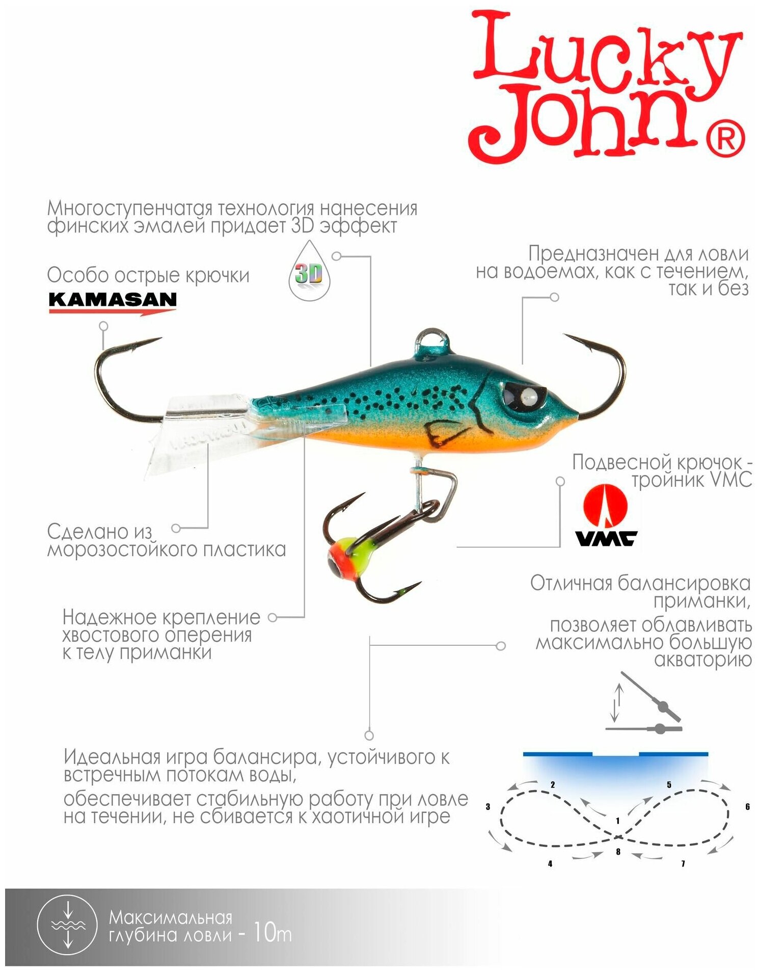 Балансир Lucky John BALTIC – довольно тяжелая приманка, она с успехом ловит рыбу на глубоких водоемах, как с течением, так и без него. Она будет очень востребована на таких крупных реках как Ока или Волга. В Хвостовое оперение может быть красным или прозрачным, изготовлено из морозостойкого пластика и приклеено к телу приманки суперпрочным клеем. Агрессивный «самурайский» взгляд, придает балансирам BALTIC узнаваемость среди приманок Lucky John, а их крупные глаза окончательно снимают все сомнения у хищной рыбы, перед атакой на беспечно плавающего «толстячка».