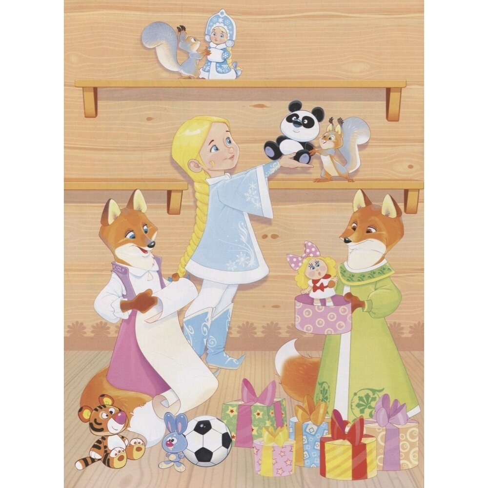 Перед Новым Годом Дедушка Мороз открывает двери своего расписного терема. Давай посмотрим, как он встречается с детишками, готовит подарки и новогоднее угощение и вместе нарядим елочку. А красочные многоразовые наклейки помогут нам в этом.