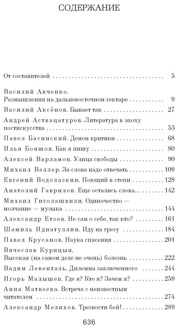 | Автор(ы) | Василий Павлович Аксёнов, Алексей Иванович Слаповский, Алексей Николаевич Варламов, Павел Васильевич Крусанов, Сергей Александрович Шаргунов, Андрей Алексеевич Аствацатуров, Вячеслав Николаевич Курицын, Михаил Георгиевич Гиголашвили, Василий Олегович Авченко, Олег Георгиевич Постнов, Вадим Андреевич Левенталь, Макс Фрай, Александр Снегирёв, Шамиль Шаукатович Идиатуллин, Александр Мотельевич Мелихов, Людмила Евгеньевна Улицкая, Михаил Иосифович Веллер, Евгений Германович Водолазкин, Марина Львовна Степнова, Леонид Абрамович Юзефович, Павел Валерьевич Басинский, Татьяна Владимировна Москвина, Александр Васильевич Етоев, Роман Валерьевич Сенчин, Александр Куприянович Секацкий, Александр Андреевич Проханов, Андрей Викторович Рубанов, Михаил Александрович Тарковский, Сергей Анатольевич Носов, Захар Прилепин, Анатолий Николаевич Гаврилов, Илья Владимирович Бояшов, Герман Умаралиевич Садулаев, Игорь Малышев, Анна Матвеева, Валерий Попов |