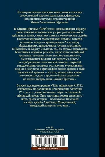 книгу включены два известных романа классика отечественной научной фантастики Ивана Ефремова. В "Лезвии бритвы" (1963) тесно переплетаются различные места действия и исторические эпохи, сюжетные линии и человеческие судьбы. Попытки разгадать тайну древней короны, которая, возможно, когда-то принадлежала Александру Македонскому, приключения группы итальянцев на побережье Намибии, где, по слухам, скрывается богатейшая алмазная россыпь, вызволение индийской красавицы-актрисы из лап алчного киномагната, опыты по пробуждению генетической памяти, сокрытой в подсознании человека, постижение художниками секретов искусства и философии былых времен и тайн физической красоты - все эти, казалось бы, никак не связанные друг с другом события разделяет, по мысли автора, лишь "лезвие бритвы"… В своем последнем романе "Таис Афинская" (1971), основанном на подлинных исторических событиях IV в. до н. э., автор воссоздает образ легендарной афинской гетеры Таис, спутницы героев античного мира, среди которых - полководец Птолемей и "царь царей" Александр Македонский, жаждущий покорить весь мир…