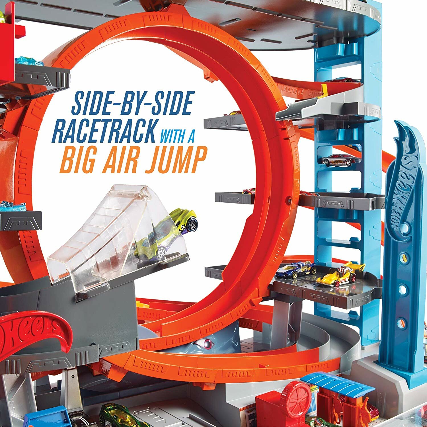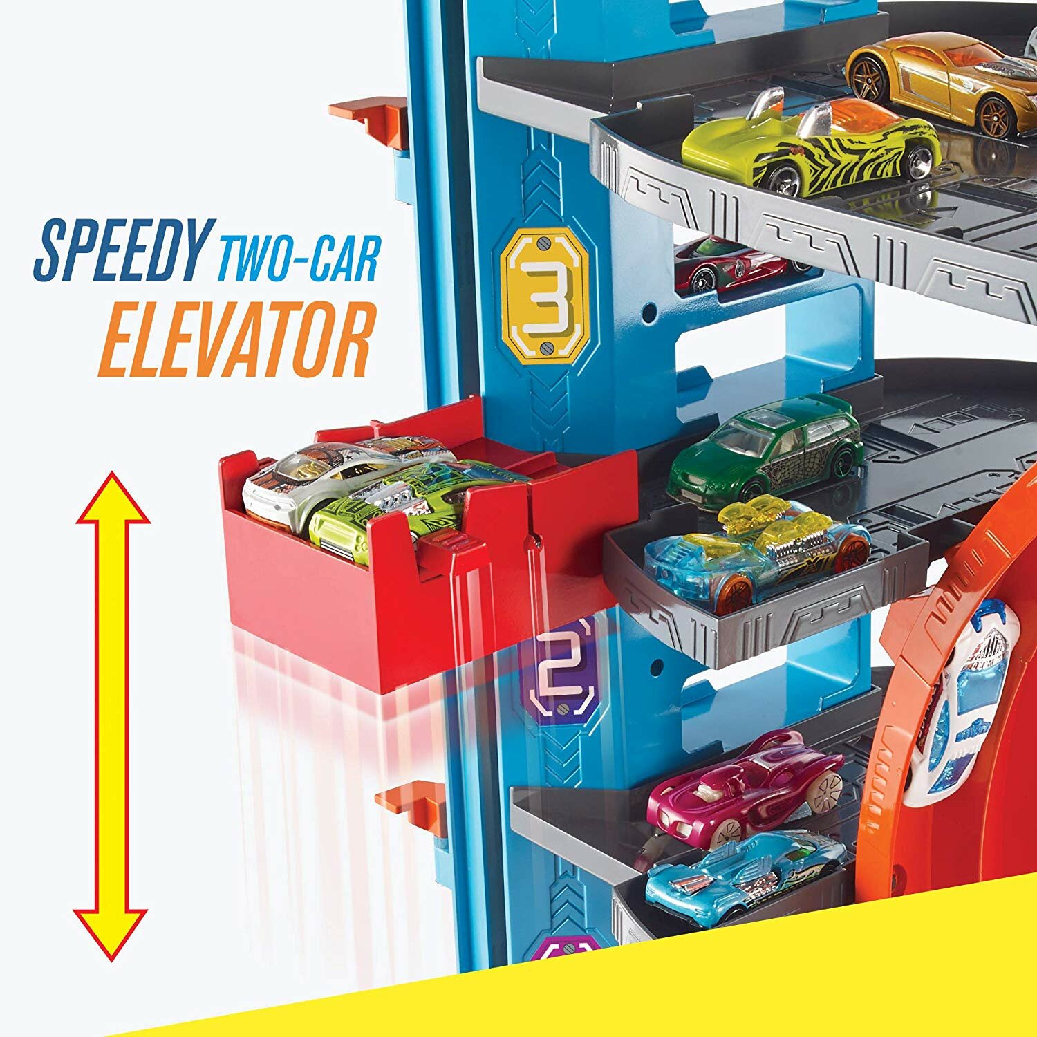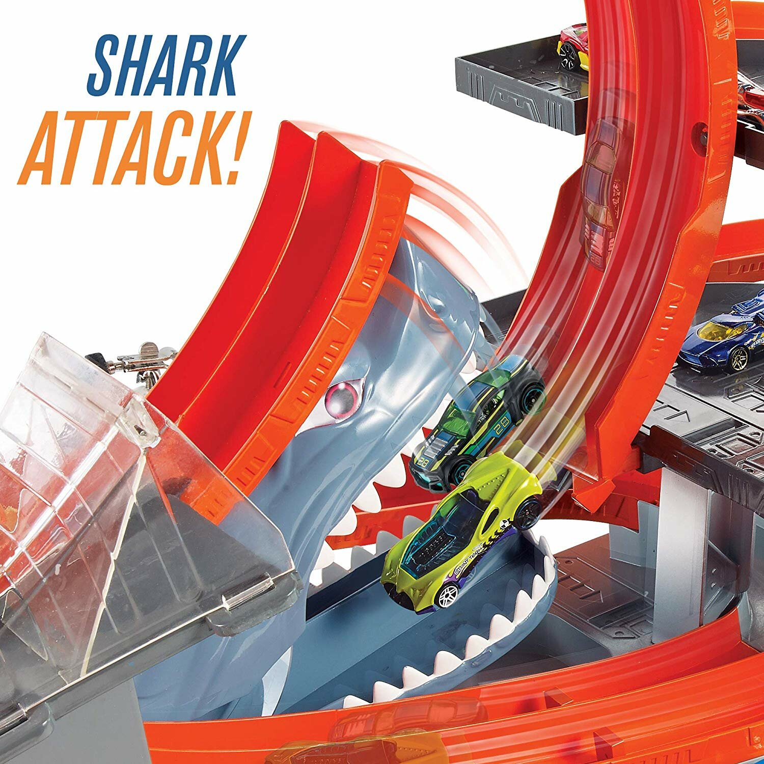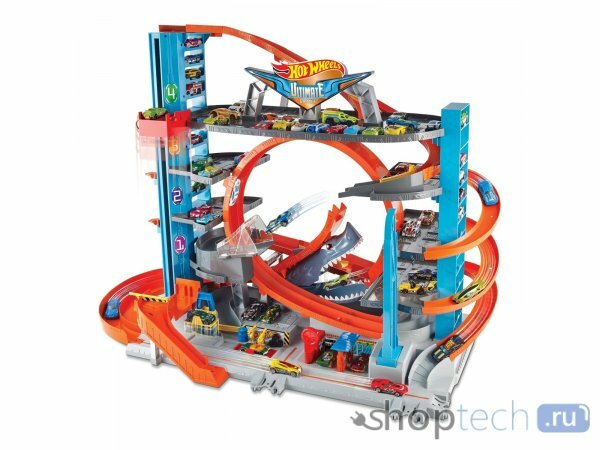 Невероятно! Этот гараж просто гигантский, он вмещает более 90 гоночных автомобилей Hot Wheels и позволяет придумывать невероятно захватывающие истории для игры. Автотрек состоит из 4-х этажей, на каждом из которых есть парковочная площадка, а на самом верхнем можно устроить настоящее ралли. Чтобы подняться туда, можно использовать лифт.Но это не все! С помощью пускового устройства можно совершать крутые трюки в «мертвой петле», однако, стоит быть осторожным, ведь есть риск угодить в пасть к гигантской кровожадной акуле.Игровой набор увлечет Вашего ребенка и будет способствовать развитию его воображения и фантазии. Он выглядит очень ярко и обладает множеством подвижных деталей, отлично сочетается с другими автотреками Hot Wheels.