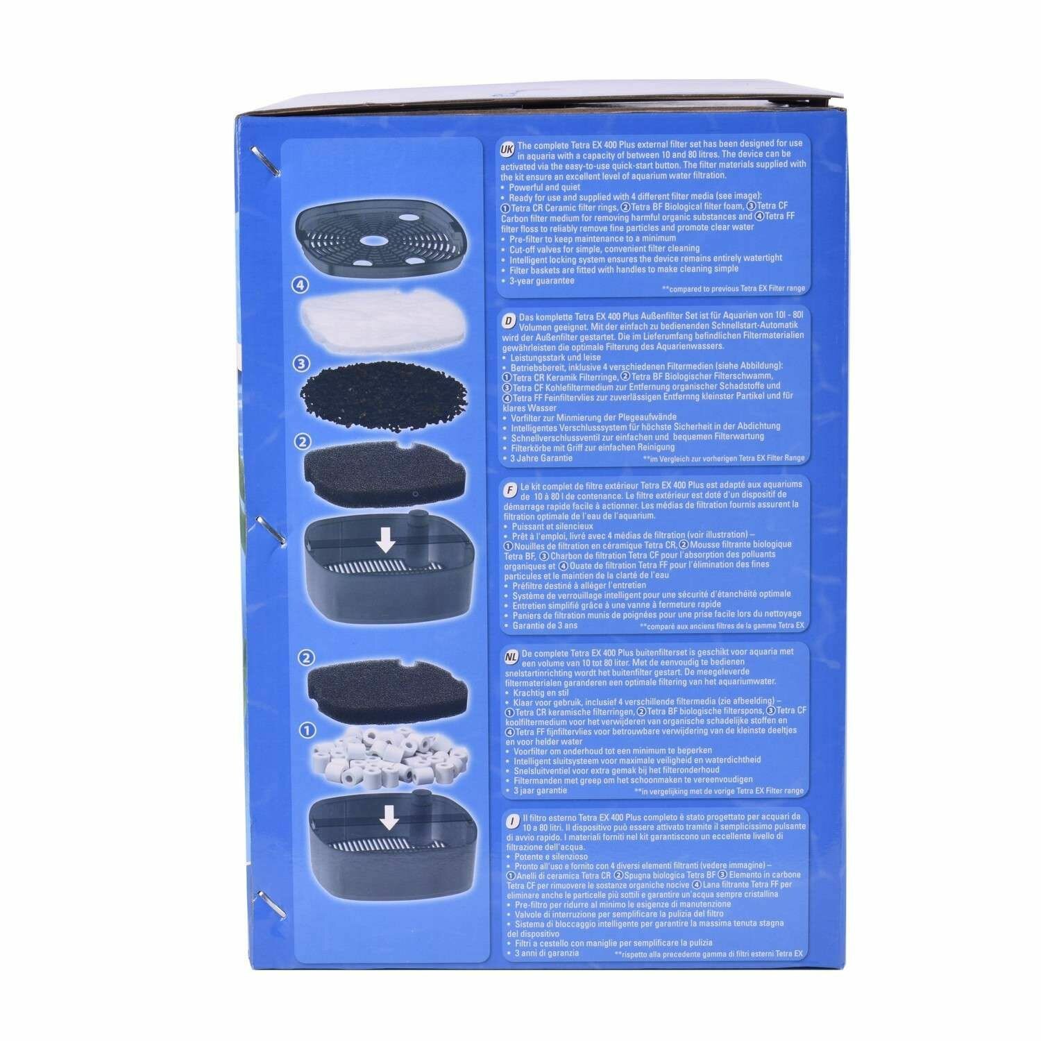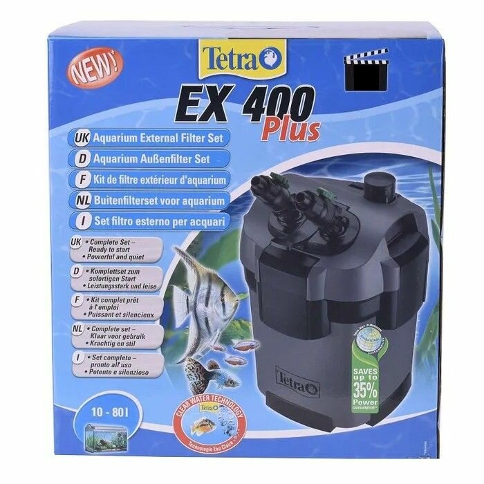 Внешний аквариумный фильтр Tetra (Тетра) EX 400 Plus для аквариумов вместимостью 10-80 л Удобен в обслуживании, осуществляет безупречную фильтрацию воды в аквариуме, работает очень тихо. Фильтрующие наполнители:FF FilterFloss Губка мелкой очисткиCF Carbon Активированный уголь2x BF BioFoam Губка для биофильтрацииCR Filterrings Керамические кольца. Очистка фильтра и замена наполнителей облегчается наличием удобных ручек на каждой из фильтрующих корзин. Сливная трубка и шланг могут быть легко отрегулированы под любой размер аквариума. Вентили, установленные на входе и выходе воды, позволяют точно настроить ее поток в соответствии с конкретными требованиями. Для очистки просто полностью закройте вентили, после чего отсоедините адаптер от самого фильтра. При этом вода остается в шлангах, что позволяет не выполнять ее повторную подкачку при следующем подключении фильтра. Фильтр предварительной очистки предотвращает загрязнение системы запуска фильтра и позволяет снизить необходимость обслуживания. В зависимости от уровня загрязнения и степени износа фильтрующие наполнители необходимо менять приблизительно каждые 6–12 месяцев. Высокое качество оборудования подтверждено трехлетним сроком гарантии.
