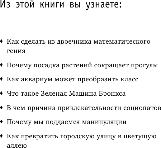 Интереснейшая, написанная умно и с юмором, история учителя, сумевшего заинтересовать учеников ДЕЛОМ - выращиванием растений - и о важных переменах в детях, этим делом увлечённых. Книга, конечно, о детях, а не о растениях, но последние здесь играют важную роль. "Вместо традиционной системы палки и морковки мы сосредоточились только на морковке", - пишет автор. Замечательная книга для учителей и родителей.