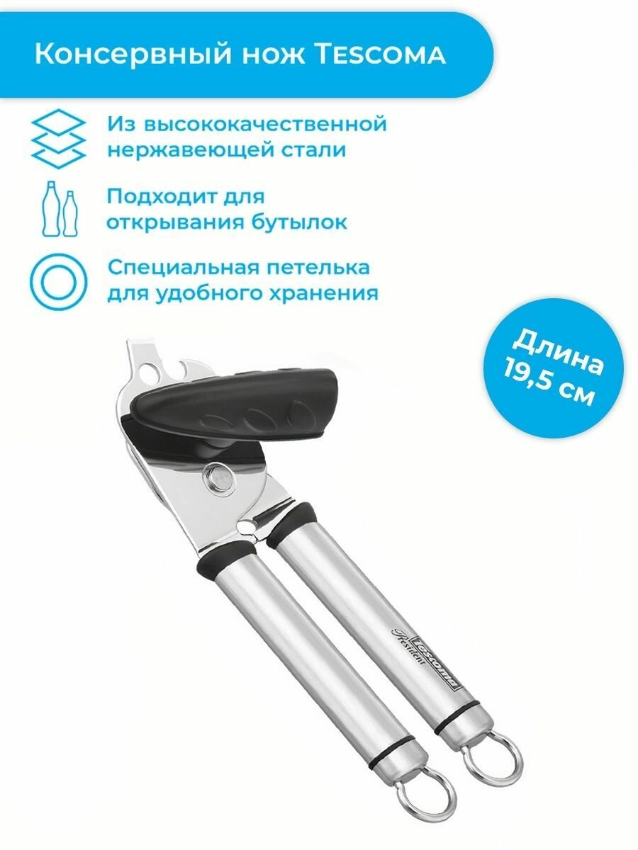 Металлический консервный нож President Tescoma: сталь и стиль! Чешская Tescoma производит широчайший ассортимент полезных предметов для тех, кто любит и умеет готовить и внимательно относится к каждой детали. Собственные лаборатории, где изделия проходят беспощадные тесты на прочность, долговечность, функциональность. Посуда и принадлежности серии President целиком выполнены из нержавеющей стали высочайшего качества и отличаются особым стилем и элегантностью.