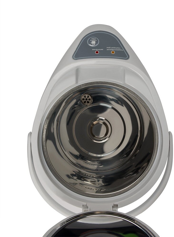 - Корпус из нержавеющей стали сделан. Крышка широко раскрывается. Без воды не включается. Объемный.