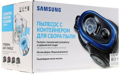 Samsung SC-18M2110SB - мощный и надежный пылесос в компактном корпусе. Простой уход Наслаждайтесь удобством турбины Anti-Tangle. Она предотвращает спутывание пыли, мусора, волос, а также обеспечивает мощность всасывания в течение длительного времени. Удобный пылесборник легко отсоединяется и очищается нажатием на кнопку. Компактный дизайн Легкая и удобная конструкция позволяет быстро проводить уборку дома. Размеры пылесоса Samsung Samsung SC-18M2110SB уменьшены на 22%.