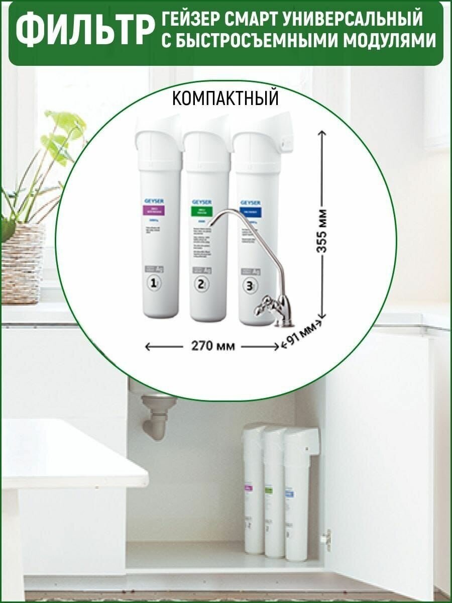 Универсальный фильтр Гейзер Смарт 11048 - небольшая трехступенчатая система очистки водопроводной воды. Позволяет очень быстро получить качественную питьевую воду. В составе данной модели применяются картриджи: карбон Ag - мультикомпонентная загрузка на основе угольных сорбентов и материала Каталон (1 ступень), комплексная очистка воды материалом Арагон (2 ступень), посткарбон Ag - высококачественный кокосовый активированный уголь (3 ступень).