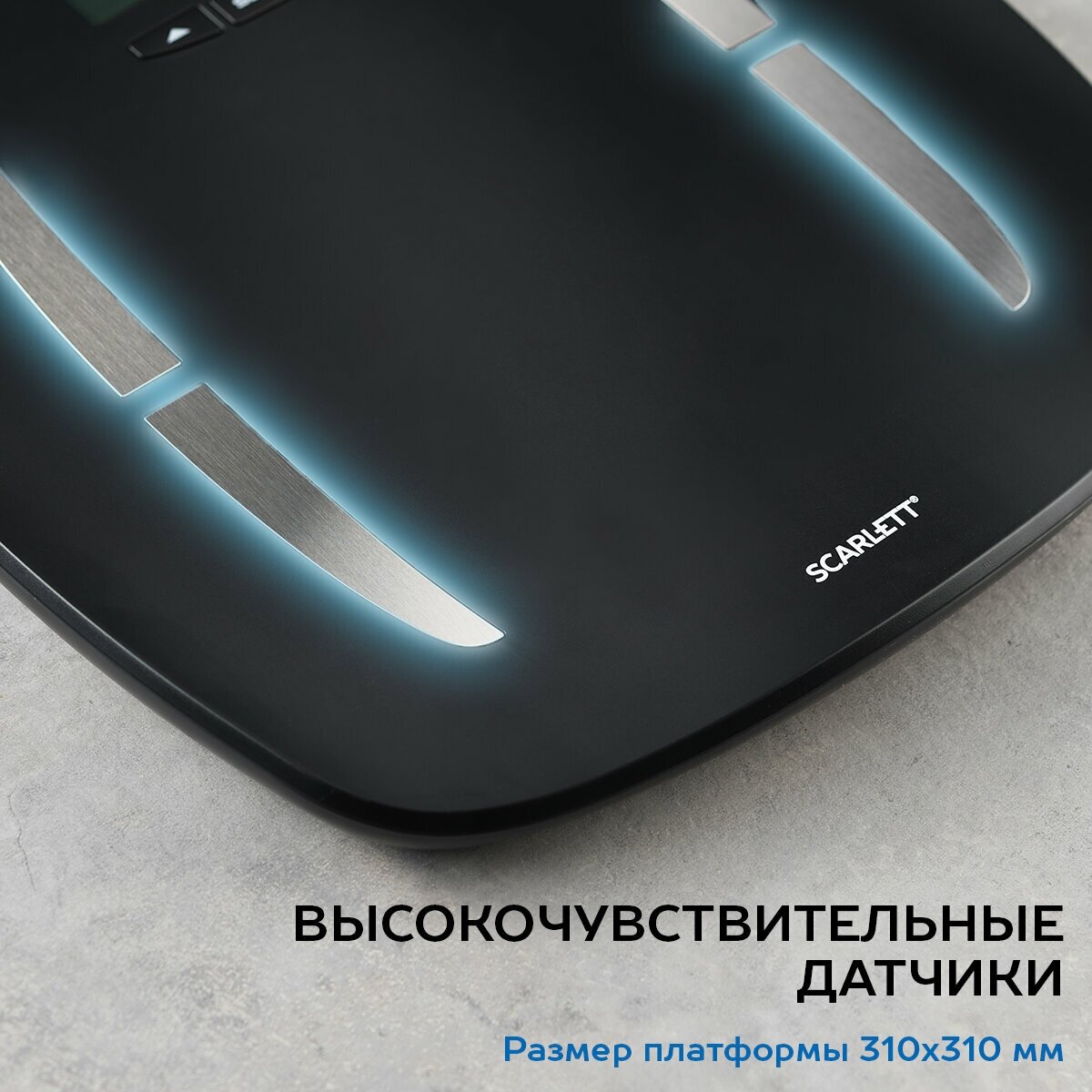 Напольные весы Scarlett - простой и удобный способ контролировать свой вес. Весы имеют высокочувствительные датчики. С помощью Scarlett SC- BS33ED83 можно не только измерить вес, но и определить процент жира, воды, мышц и костной массы. Весы обладают встроенной функцией памяти на 12 человек. Корпус изготовлен из высокопрочного пластика. На нижней части прибора расположены прорезиненные ножки для предотвращения скольжения.