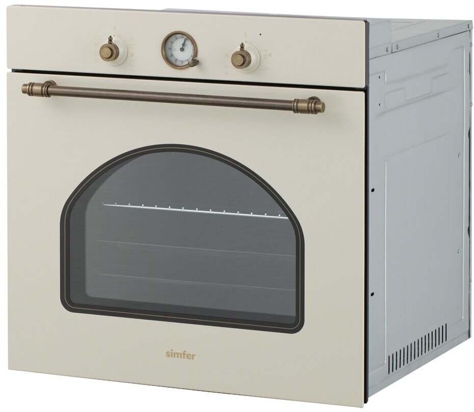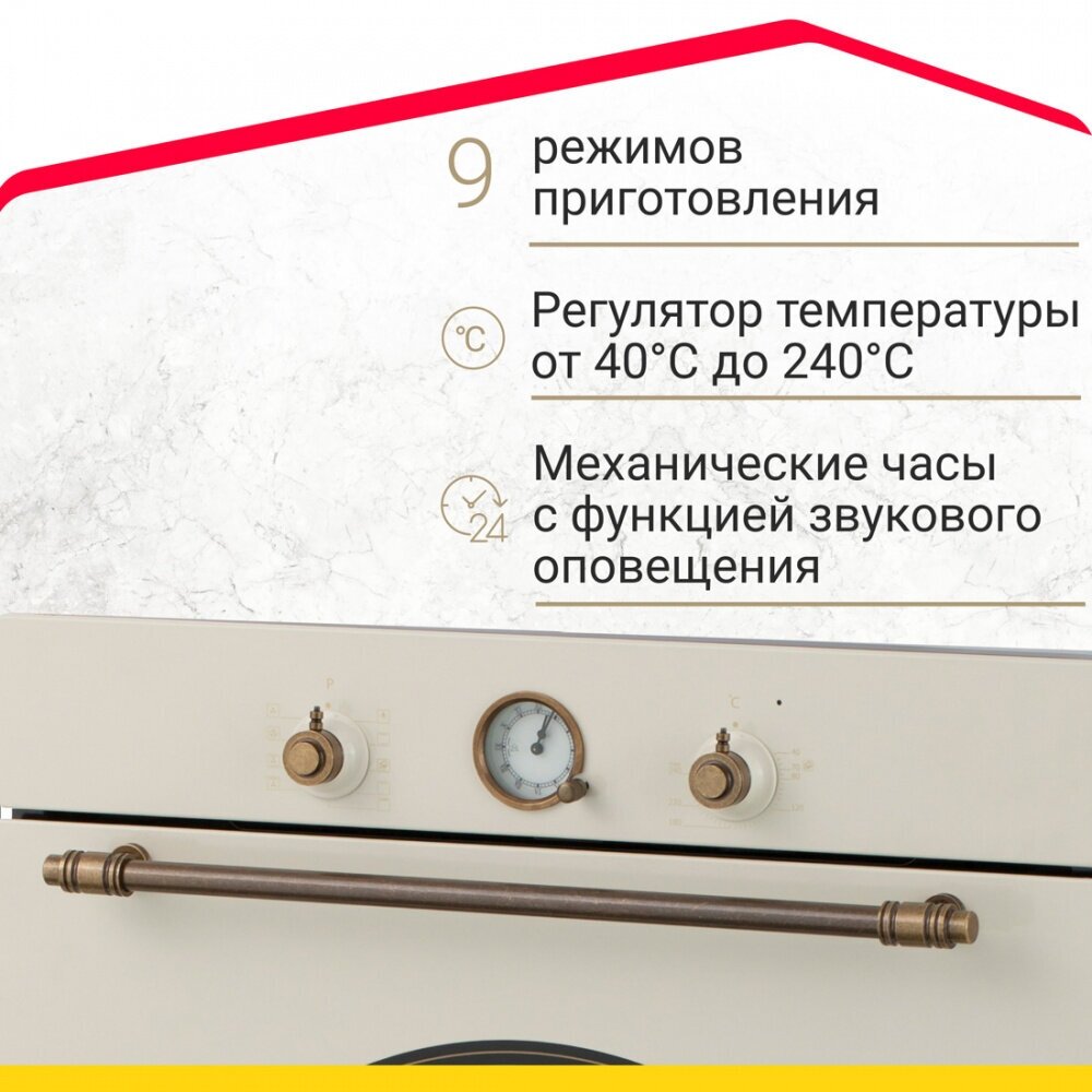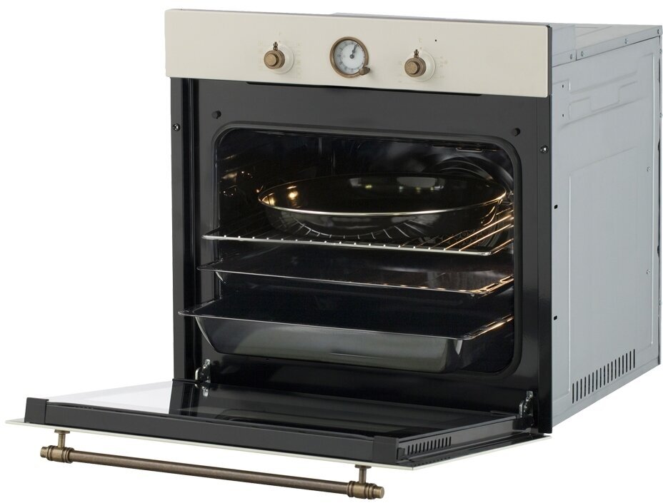 Встраиваемый духовой шкаф бежевого цвета в ретро стиле прекрасно подойдет для классических кухонь. Таймер, стилизованный под старинные часы, вовремя выключит духовку, и ваши блюда не пригорят. В комплекте к духовке идет решетка и два противня. Это позволит вам готовить два блюда одновременно. Объем духовки 58 литров. Класс энергосбережения А.