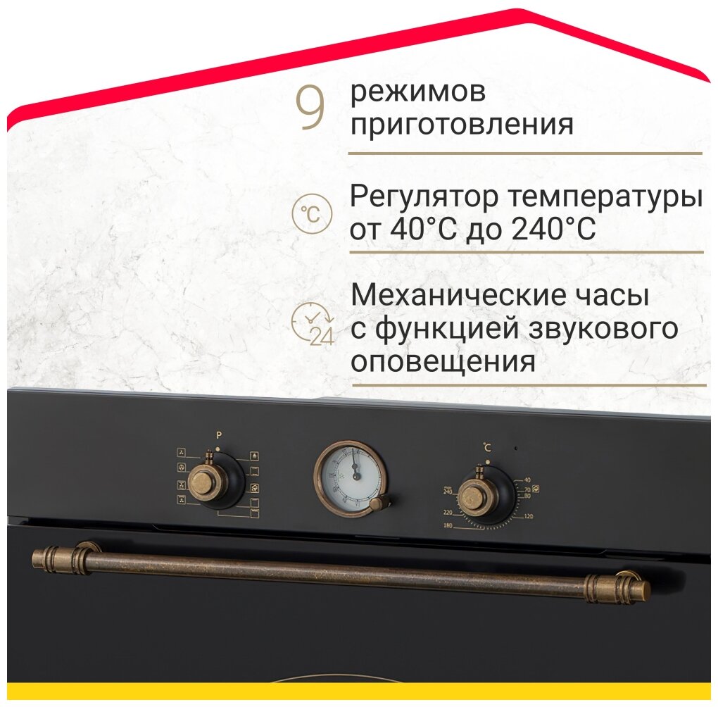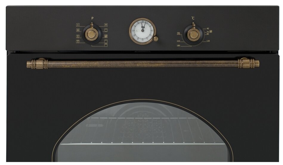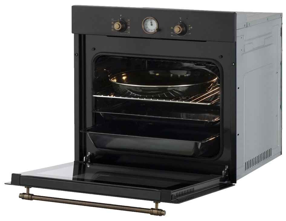 Встраиваемый духовой шкаф черного цвета в стиле ретро идеально подойдет для классических кухонь. Таймер программатор облегчит процесс приготовления блюд. В комплекте к духовке идет решетка и два противня. Это позволит вам готовить два блюда одновременно. Объем духовки 56 литров. Класс энергосбережения А.