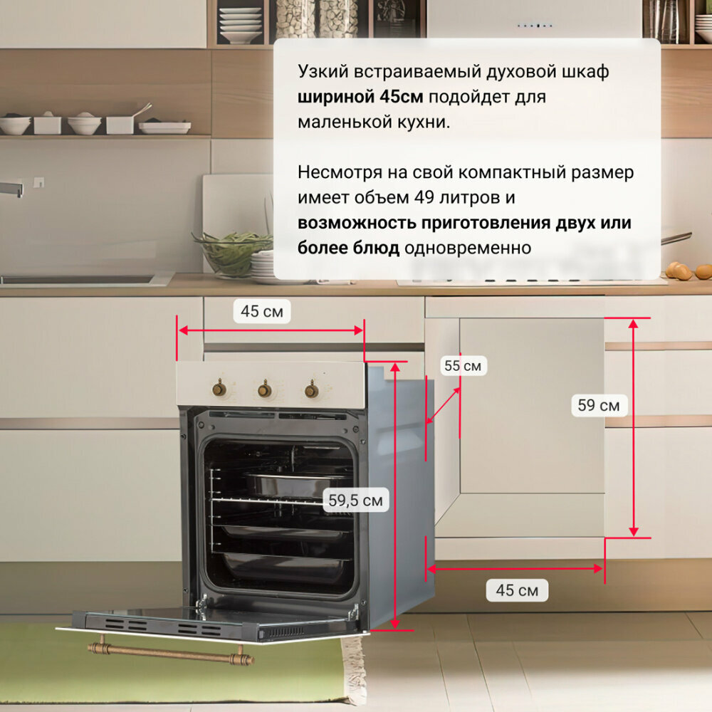 Встраиваемый компактный духовой шкаф бежевого цвета в ретро стиле прекрасно подойдет для классических кухонь. В комплекте к духовке идет решетка и два противня. Это позволит вам готовить два блюда одновременно. Объем духовки 49 литров. Класс энергосбережения А. Крупногабаритный товар.