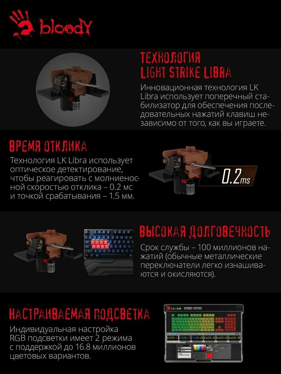 | Особенности | съемная подставка для запястья, усиленный пробел защита от попадания жидкостей все кнопки Anti-ghost технология: Light Strike LIBRA |
