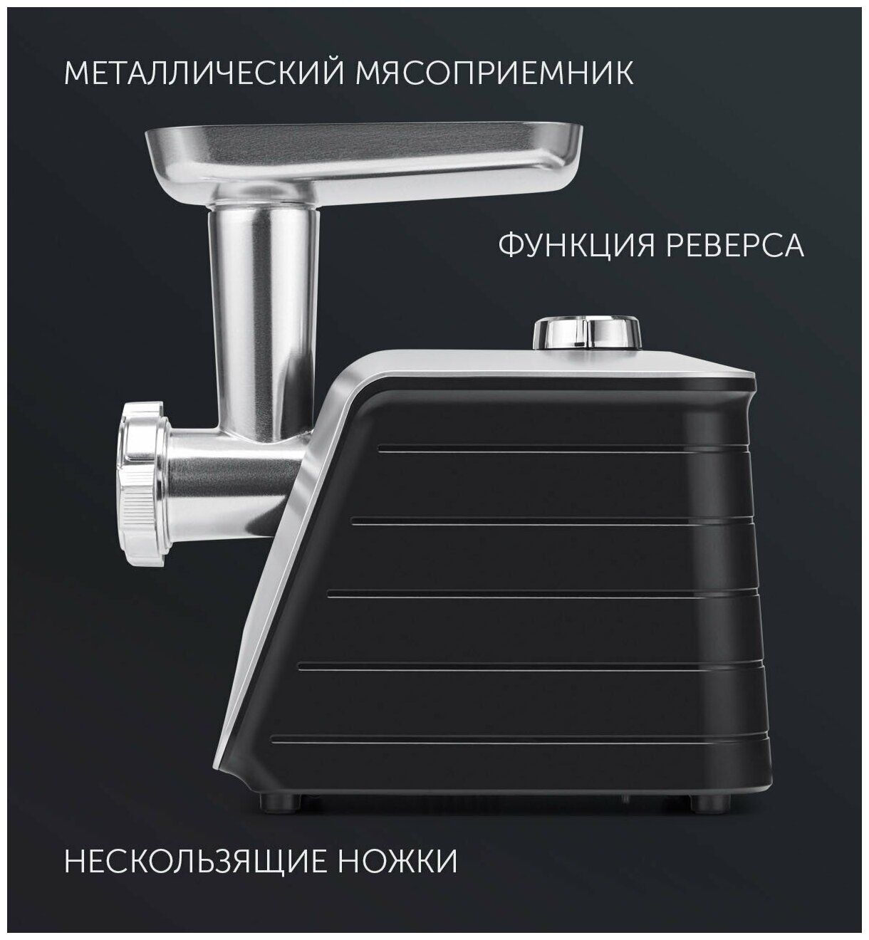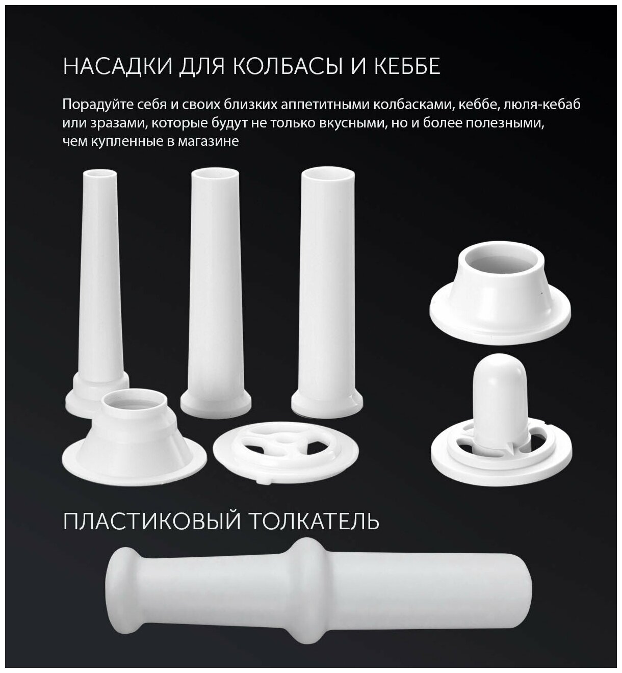 | Насадки | диск/решетка для фарша (3 решетки, диаметр отверстий 3/5/7 мм), для «кеббе», для домашней колбасы (3 шт) |