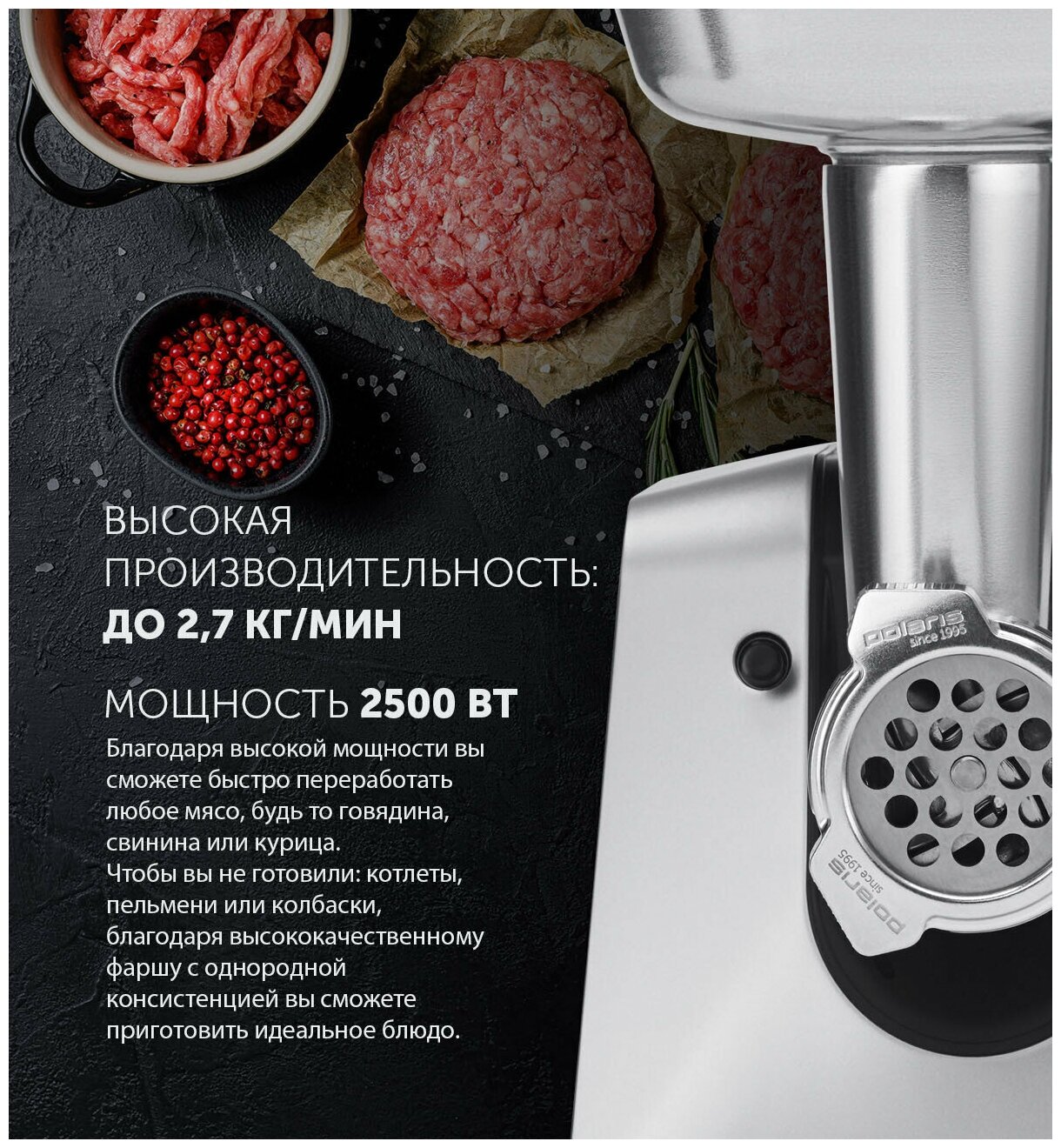 Polaris Polaris - это мощная электрическая мясорубка, отличающаяся высокой производительностью. Обладая максимальной мощностью в 2500Ватт, этот прибор способен перемолоть до 2,7 кг в минуту. Таким образом, на приготовление фарша уходит намного меньше времени, чем если бы Вы делали это вручную, а значит баловать себя блюдами из этого продукта можно намного чаще.