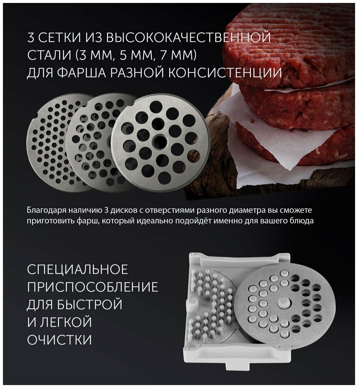 | Диск для фарша | 3 в комплекте, диаметр отверстий 3 мм, 5 мм, 7 мм |