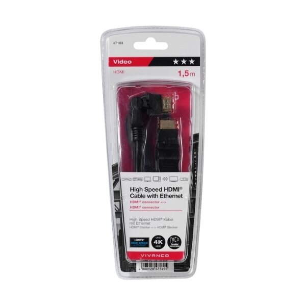 HDMI-кабель VIVANCO снабжен подвижными штекерами, которые можно наклонять вправо и влево, а также поворачивать на 360 относительно корпуса. Это значительно облегчает подсоединение к мультимедийным устройствам с нестандартно расположенными интерфейсами. Универсальная модель оптимально подходит для коммутации между ноутбуком, монитором, проектором. Применение современных технологий производства обеспечивает высокую скорость передачи видео и аудио в цифровом формате. Проводник надежно изолирован от электромагнитных воздействий, влаги и механических повреждений. Специальное напыление предотвращает коррозию и окисление коннекторов.