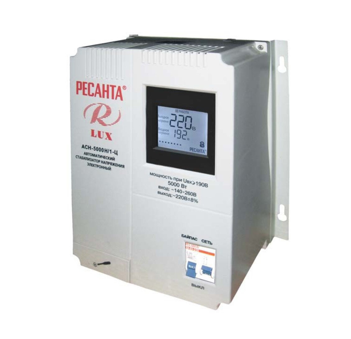 | Прочие особенности и свойства | Стабилизатор напряжения серии LUX РЕСАНТА АСН-5000Н/1-Ц релейного типа предназначен для выравнивания входного напряжения и защиты приборов от перепадов напряжения с суммарной мощностью до 5 кВт. Работает с напряжением 220В с точностью до +/-8%. Устройство оснащено фильтрами сетевых помех, предотвращающими искажение частотной синусоиды, микропроцессорным управлением и цифровым индикатором напряжения. Превышение пределов поддерживаемого входного напряжения автоматически отключает подачу питания. Прочный корпус защищает внутренние узлы аппарата от повреждений. Данный стабилизатор может обеспечивать стабильным питанием - телевизор, ресивер, DVD проигрыватель, кассовый аппарат, газовый котел.,,Особенность данного стабилизатора в возможности крепления его на стену.,,За счет своего принципа работы такой стабилизатор позволяет моментально реагировать даже на самые значительные и частые изменения напряжения в сети и предотвратить выход оборудования из строя. Номинальная мощность при входящем напряжении 190В составляет 5000Вт. Количество фаз = 1.,,Системы защиты:,- Защита от выхода напряжения за пределы рабочего диапазона стабилизатора (рабочий диапазон стабилизатора от 140 до 260 В).,- Термозащита (тепловая защита) позволяет выключиться стабилизатору при превышении его мощности нагрузки над мощностью самого устройства.,,Преимущества:,- Встроенные фильтры входных и выходных частотных помех.,- Автоматическое отключение питания при превышении предельного значения напряжения.,- Широкий диапазон поддерживаемого входного напряжения.,- При кратковременных перегрузках прибор не выключается.,- Автоматическое включение при выравнивании напряжения в пределах рабочего диапазона.,- Микропроцессорное управление.,- Компактные габариты.,- Высокая скорость срабатывания защиты. |