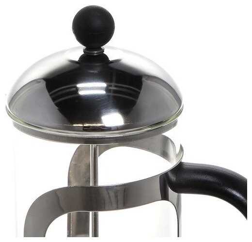 Встроенный в крышку пресс-фильтр. Емкость из жаропрочного стекла. Конструкция носика: "антикапля" удобна для разливания напитка в чашки. Надежное устройство фильтра обеспечивает идеальную фильтрацию ароматного напитка. Основание и крышка из нержавеющей стали. Ручка из пластика.