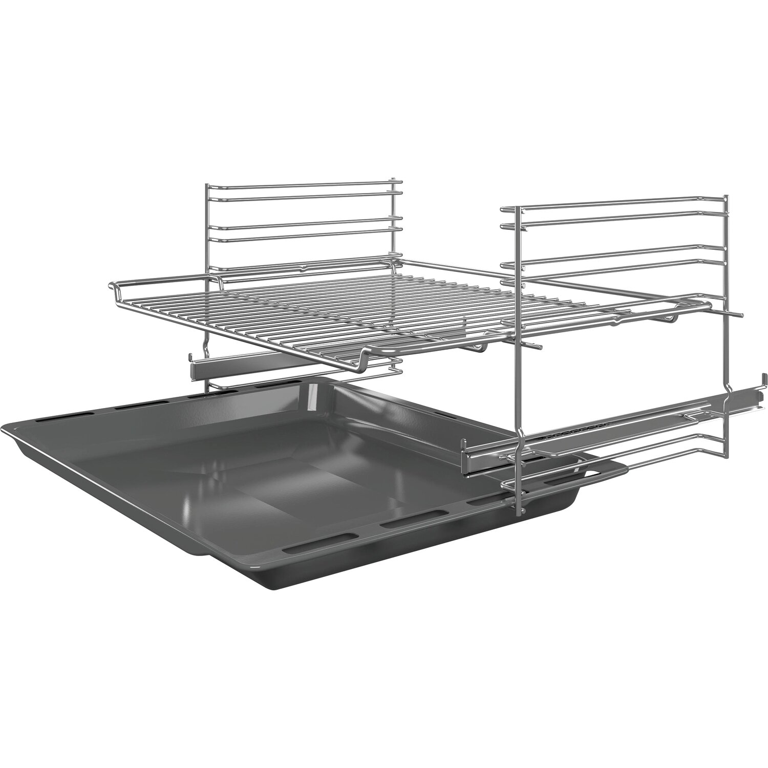 Управлять прибором можно с помощью поворотных переключателей и сенсорной панели. Панель управления духовки Bosch изготовлена из нержавеющей стали со стеклянными вставками. Максимальная температура внешнего стекла дверцы 50°C. Прибор оснащен телескопическими направляющими на 1 уровне.