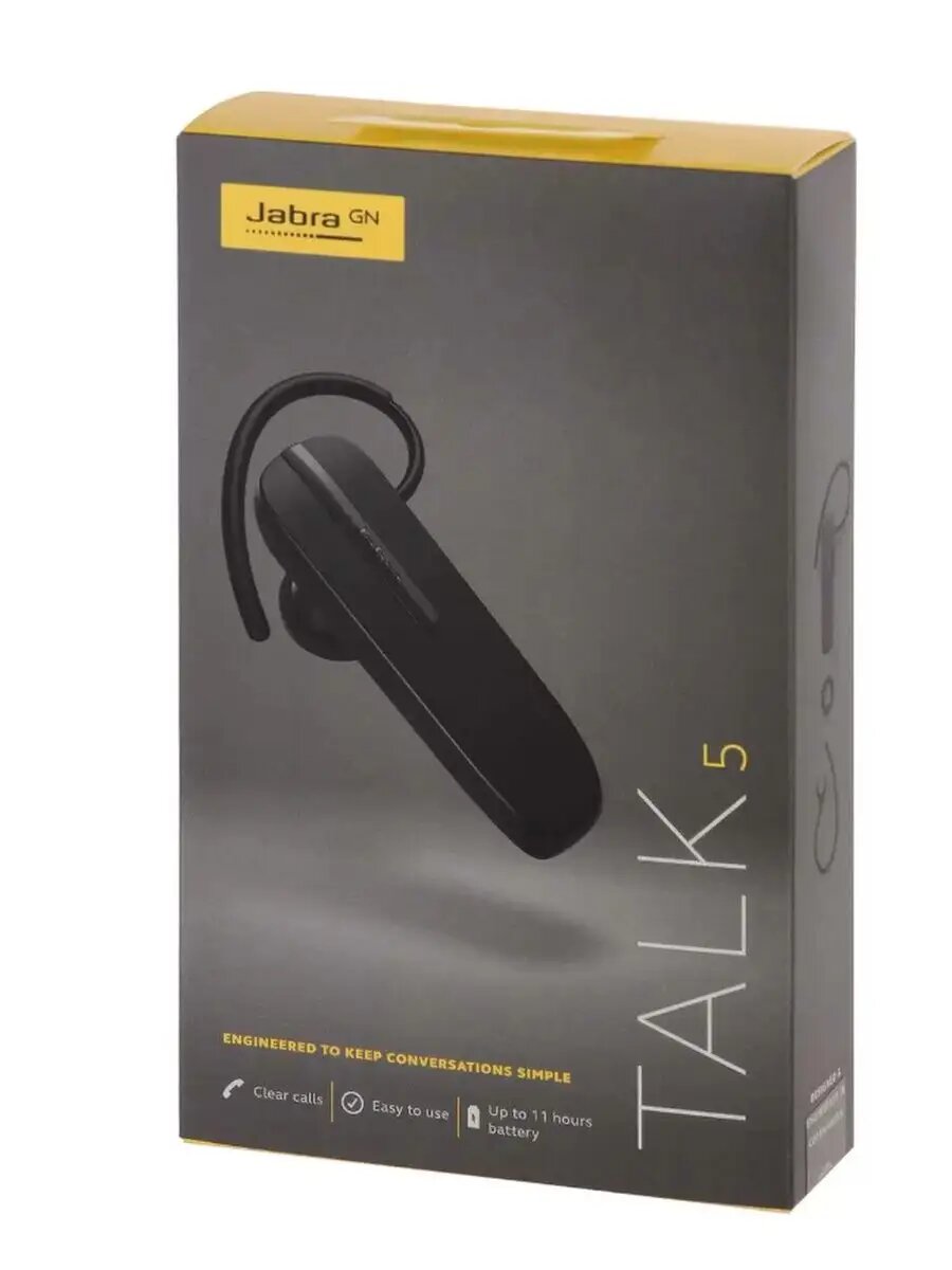 | Комплект поставки | Гарнитура Jabra Talk 5, Кабель микро-USB, 1 гелевый ушной вкладыш EarGel, 1 наушное крепление EarHook, Краткое руководство пользователя |