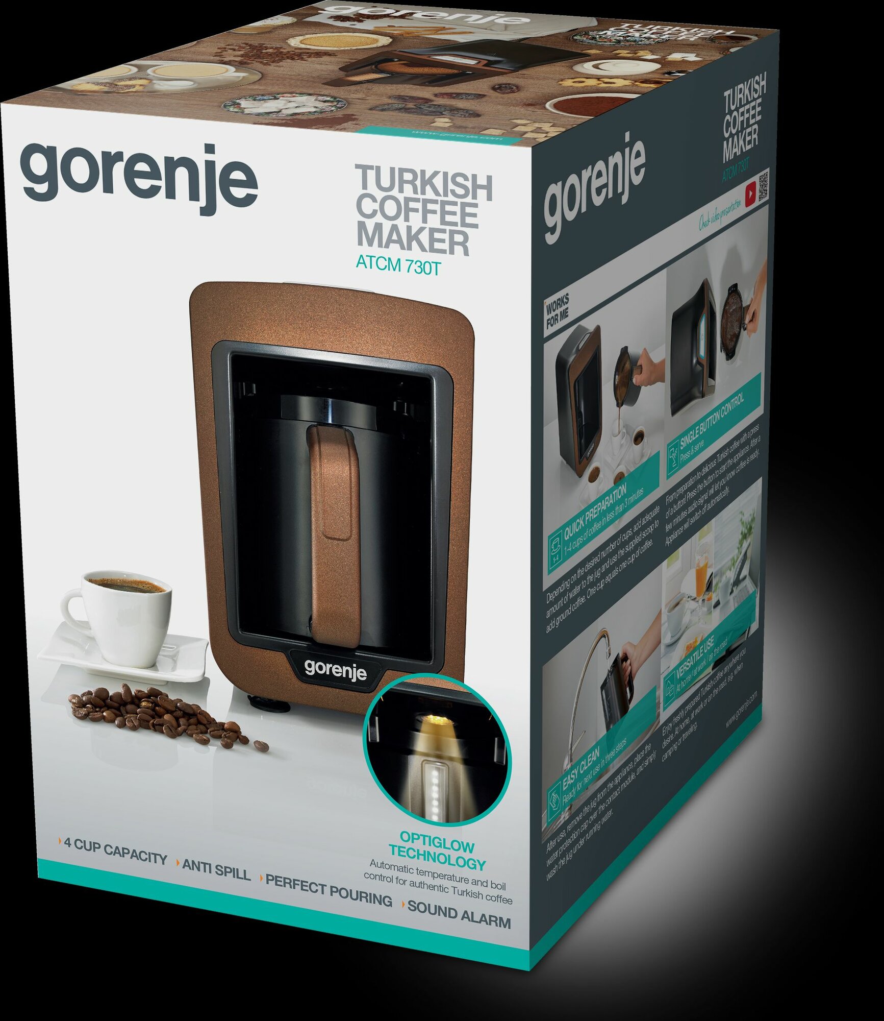 Кофеварка Gorenje предназначена для рецепта «по-турецки». В специальную кружку заливается холодная вода и насыпается свежемолотый кофе. Емкость ставится в платформу для нагрева. Термостат Strix регулирует нагрев, поэтому прибор отключится сразу после закипания.