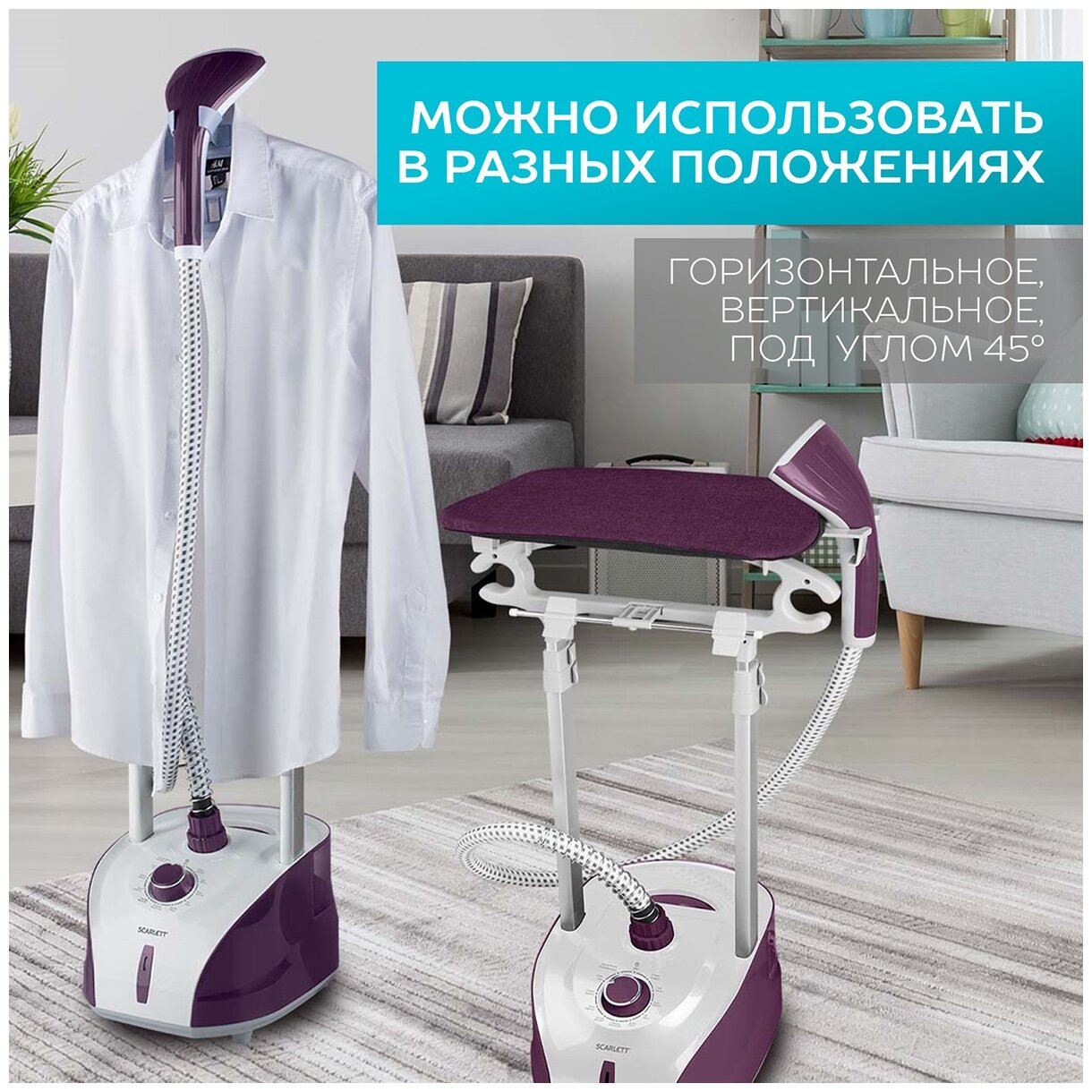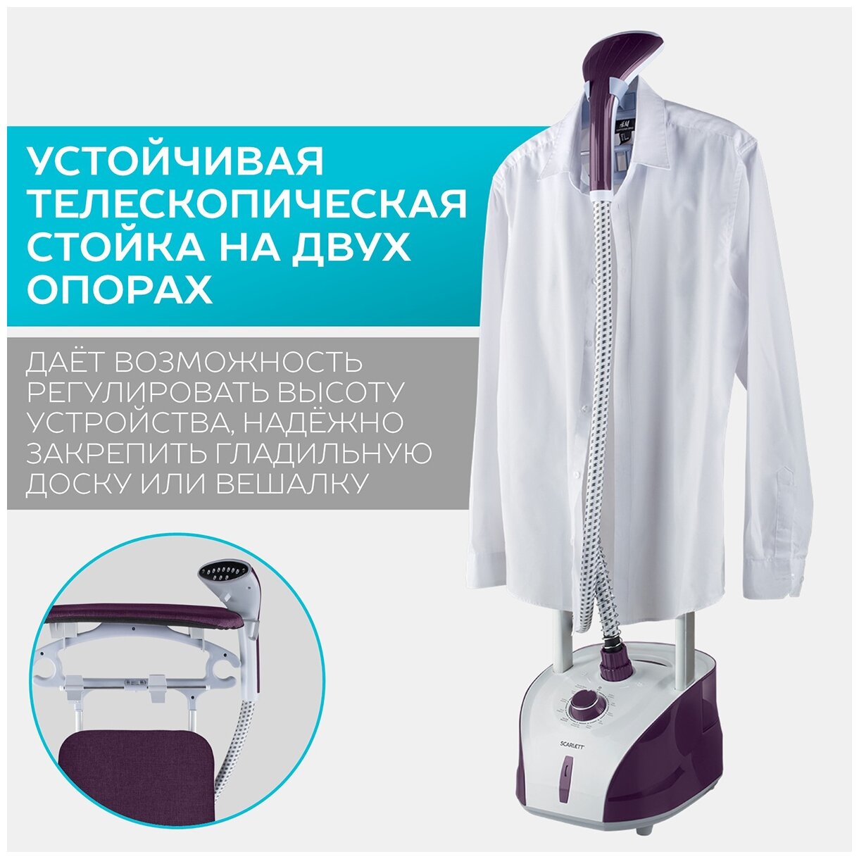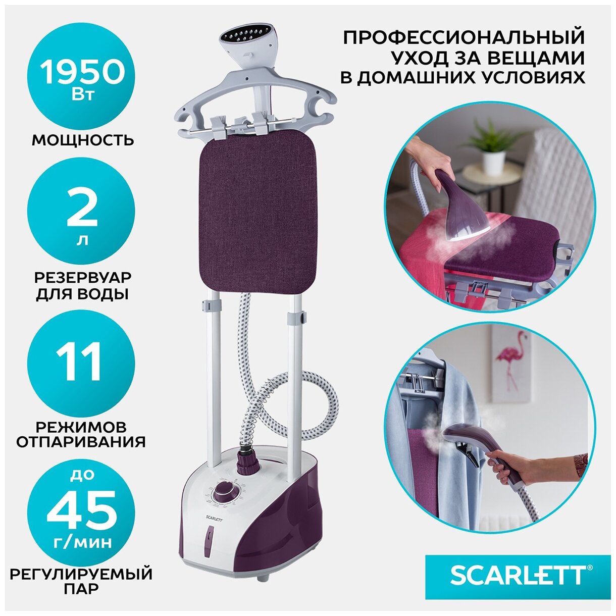 Scarlett – вертикальный отпариватель, предназначенный для ухода за одеждой и другими вещами из ткани. Он оборудован телескопической стойкой, длину которой можно изменять в зависимости от размеров одежды, и зажимами для юбок и брюк, а также вешалкой. выберите оптимальный вариант Ступенчатая регулировка силы пара даёт возможность отыскать режим, который наилучшим образом подходит для разглаживания того или иного изделия.