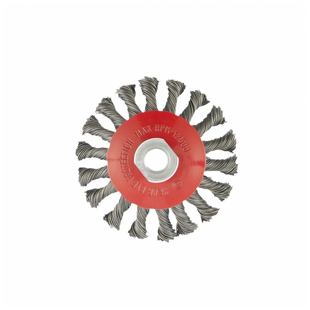 Щетка для УШМ Matrix , 100 мм, М14, тарелка, крученая проволока 0,5 мм устанавливается на УШМ при помощи гайки М14. Выполнена в форме тарелки, за счет чего подходит для грубой (черновой) обработки плоских и угловых поверхностей. Удаляет ржавчину, загрязнения, лакокрасочные покрытия, подходит для зачистки сварных швов. Использование на скорости до 12500 об/мин позволяет продлить срок службы насадки.Преимущества Износостойкость — щетина изготовлена из высококачественной стальной проволоки Универсальность — насадкой можно обрабатывать различные твердые материалы: металл, древесину, пластик, бетон Антикоррозийная защита — на корпус нанесено эмалевое покрытие, щетина покрыта техническим маслом