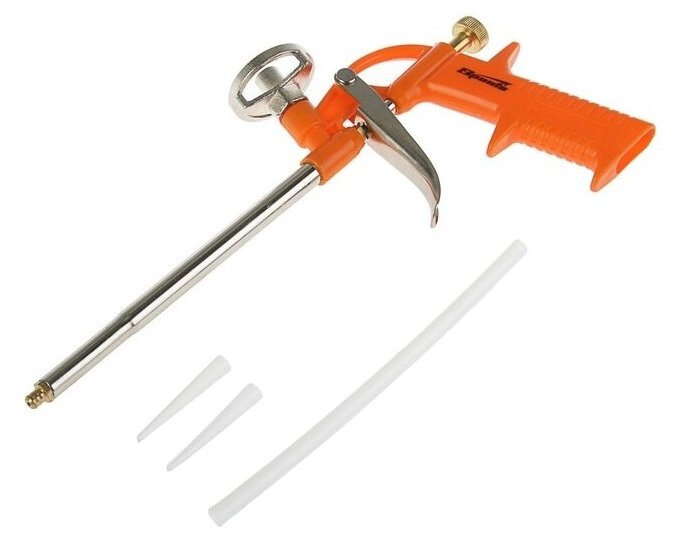 Пистолет для монтажной пены это простой в обращении инструмент, предназначенный для ремонтных и монтажных работ. С его помощью можно заполнить пустоты и полости, образовавшиеся при монтаже окон, дверей и т.д. Пистолет имеет облегченный корпус и удобную пластиковую рукоятку, что обеспечивает комфортную работу. Благодаря длинному стержню можно работать в труднодоступных местах.
