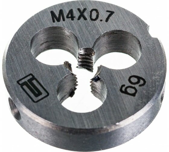 Плашка круглая СИБРТЕХ предназначена для нарезания внешней метрической резьбы.Твердость режущих кромок 60 HRC, что соответствует требованиям ГОСТ 9740-71.Изготовлена из инструментальной стали 9ХС.
