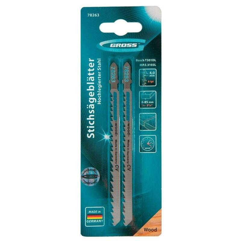Тип: набор полотен для лобзика; Назначение: дерево; Количество в упаковке: 2; Размеры: общая длина: 132 мм / рабочая длина: 110 мм / ширина: 7.6 мм; Особенности: чистый рез; Прочие характеристики и свойства: Полотно для электролобзика изготовлено из высококачественной инструментальной немецкой стали и предназначено для распила заготовок из древесины как твердых, так и мягких пород, а также ДВП, ДСП и прочих композитных материалов, основу которых составляет дерево. Полотно длиной 132 мм и толщиной 1,45 мм с шагом зуба 6 TPI позволяет пилить изделия толщиной от 6 до 100 мм. Место распила имеет аккуратную и ровную кромку благодаря отшлифованной под конус боковой поверхности полотна.
