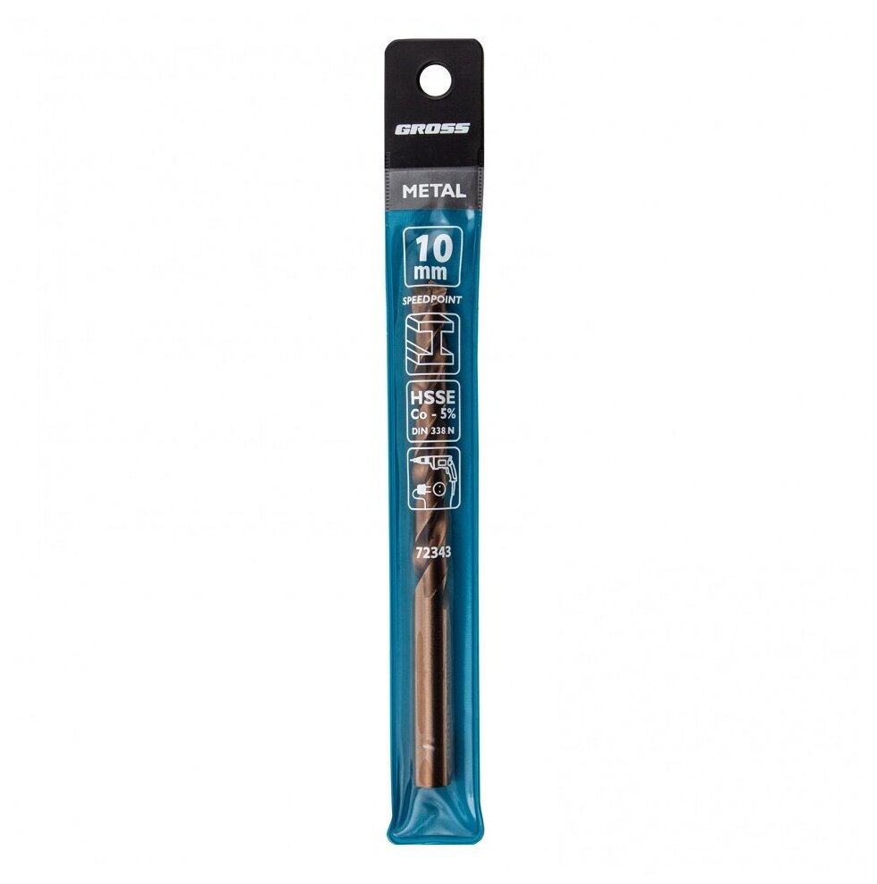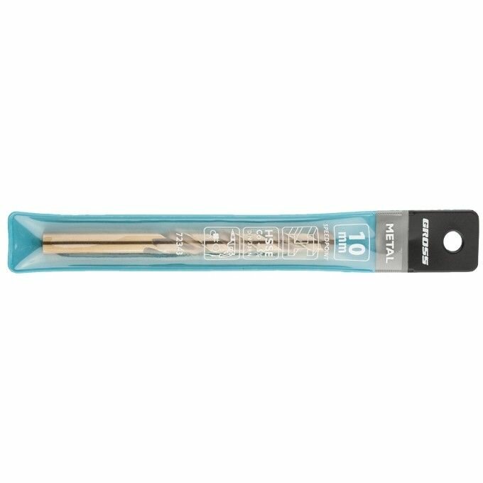 Сверло спиральное торговой марки GROSS относится к режущим инструментам и предназначено для получения отверстий в легированной и нелегированной стали, чугуне, цветных сплавах и жестких пластиках. Диаметр сверла составляет 10 мм, длина сверла — 133 мм, а длина спиральной части — 87 мм. Изготовлено сверло из быстрорежущей (HSS) легированной стали М35 с добавлением кобальта, улучшающего такие механические свойства стали, как твердость и износоустойчивость при повышенных температурах.