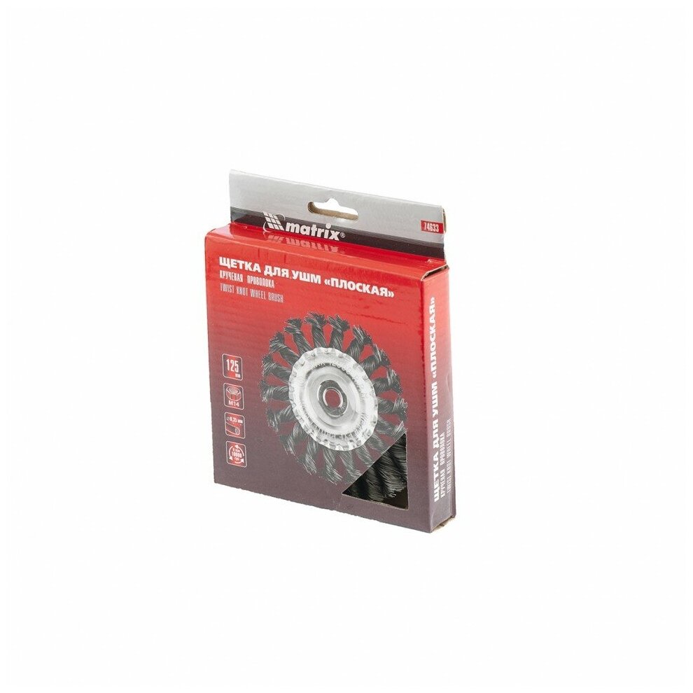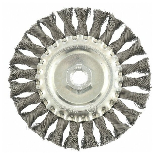 Плоская щетка для УШМ Matrix диаметром 125 мм, с крученой проволокой 0,35 мм и гайкой М14 используется для грубой (черновой) обработки поверхностей. Она устанавливается в качестве оснастки на УШМ. Благодаря щетке можно снять толстый слой ржавчины, лакокрасочных покрытий, загрязнений, а также зачистить сварные швы. За счет плоской формы ею удобно проводить обработку в труднодоступных местах: углах, изгибах и др. А благодаря щетине 0,35 мм осуществляется менее агрессивная зачистка по сравнению с щетиной 0,5 мм. Эксплуатация щетки допускается на скорости не более 10000 об/мин. ПреимуществаЩетина из прочной стальной проволоки обеспечивает высокий ресурс щетки. Щетка универсальна и может использоваться для обработки различных поверхностей: металлических, в т. ч. из цветных металлов, деревянных, пластиковых. Щетина обработана маслом, а корпус покрыт цинком для повышения антикоррозионных свойств щетки.